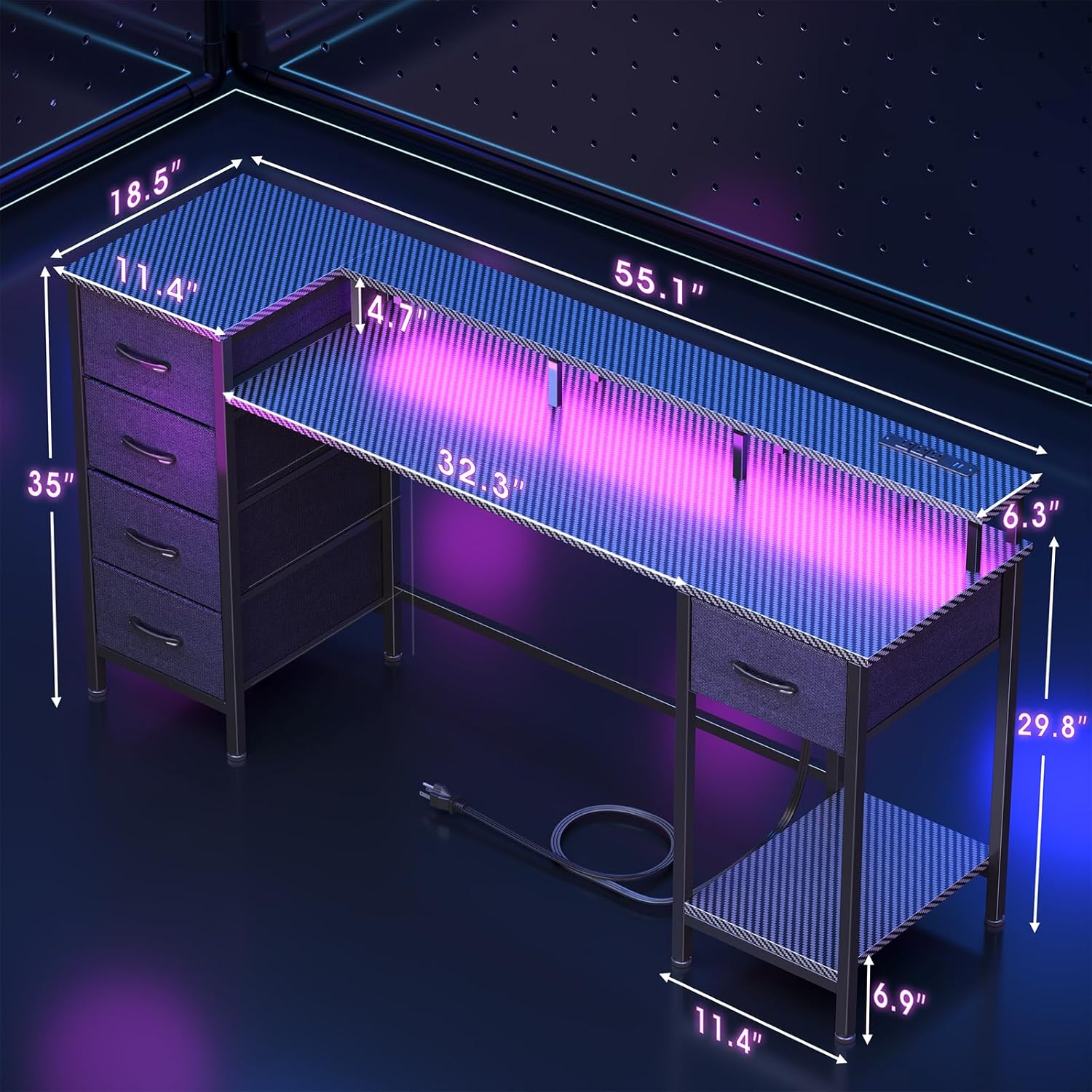 55 Inch Computer Gaming Desk with Power Outlets LED Lights, Reversible Home Office with Adjustable Fabric Storage Drawers for Working Writing Study,Carbon Fiber Black