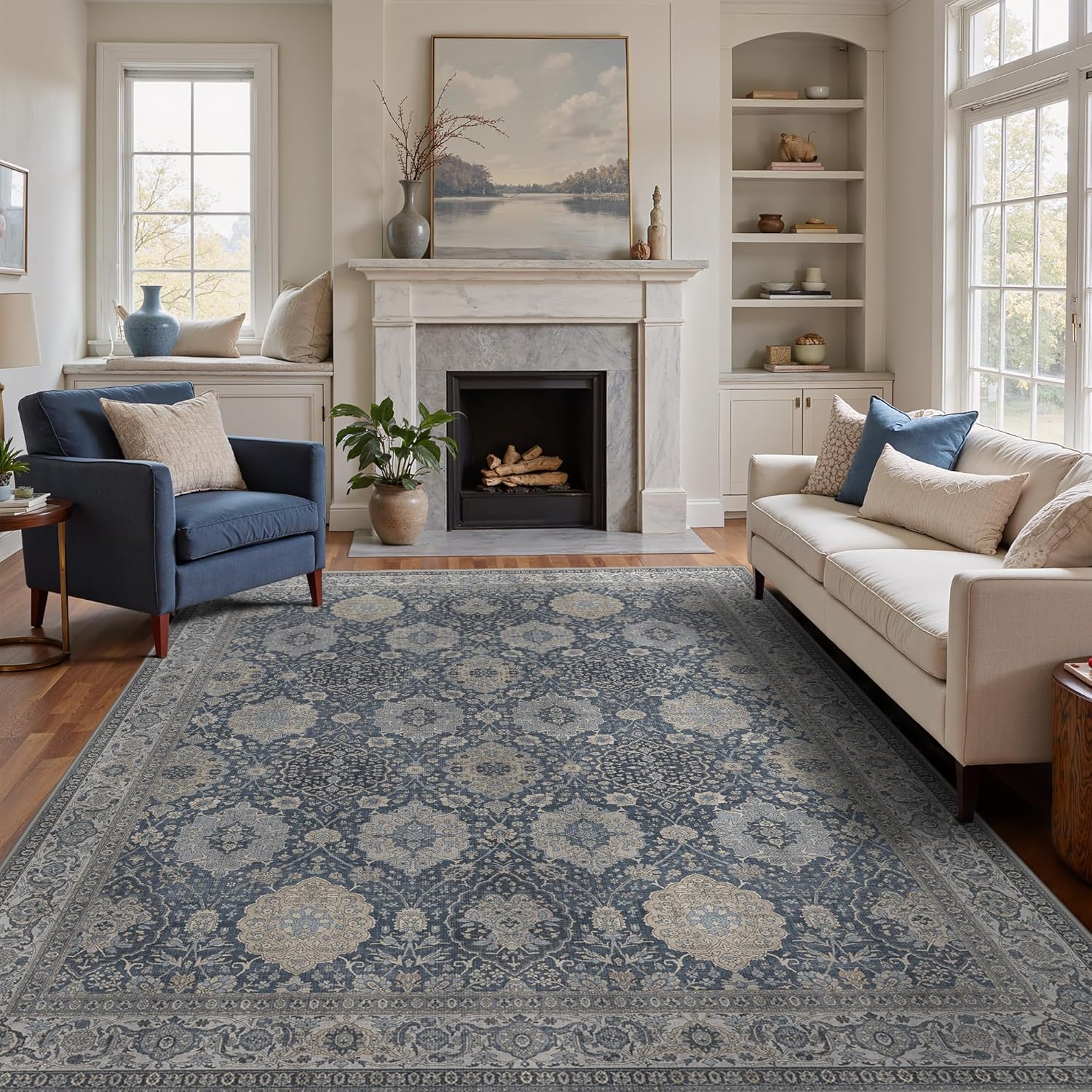 8X10 Area Rugs Machine Washable Rugs for Living Room, Vintage Boho Large Rugs for Bedroom Dining Room, Non Slip Indoor Soft Distressed Lightweight Thin Low Pile Carpet, Slate Blue