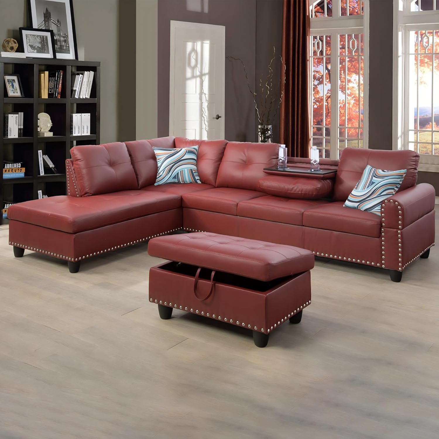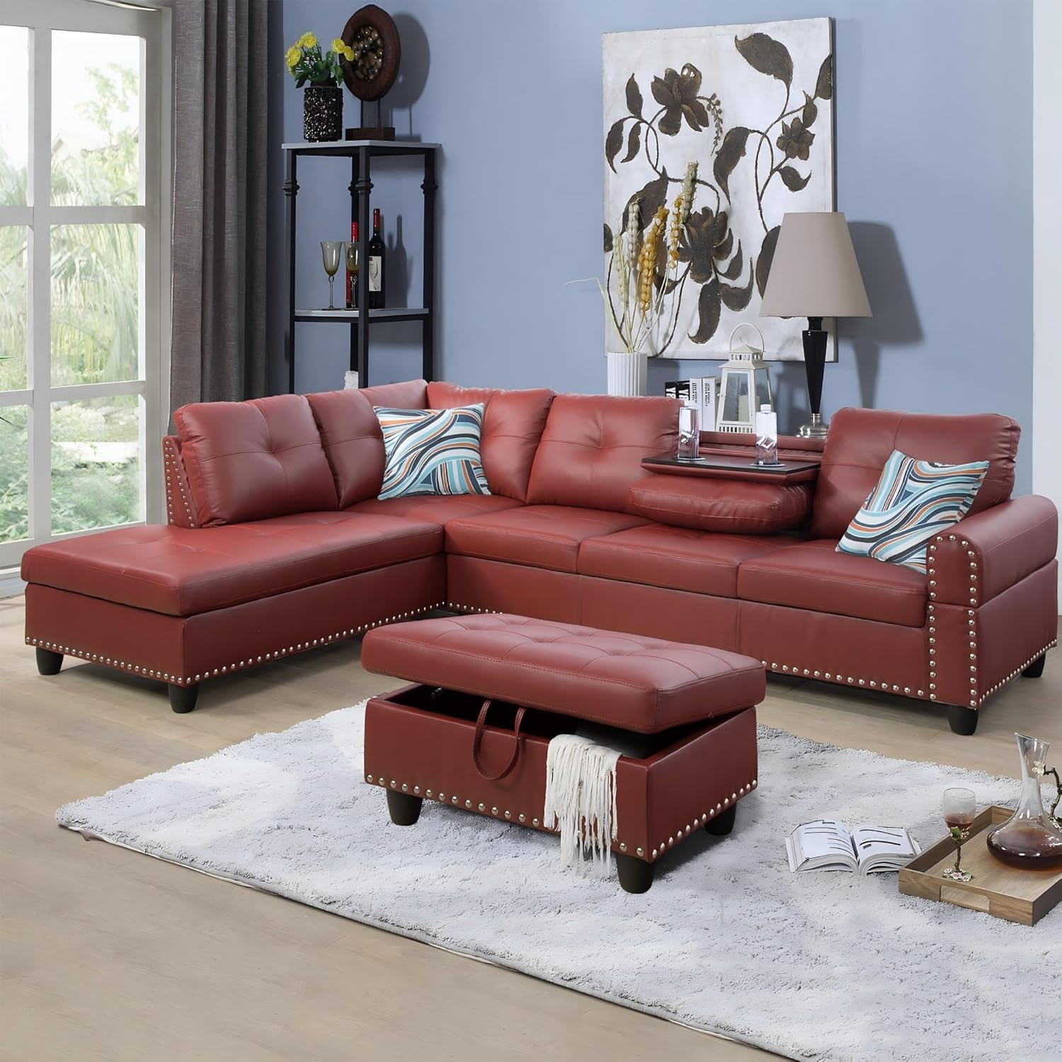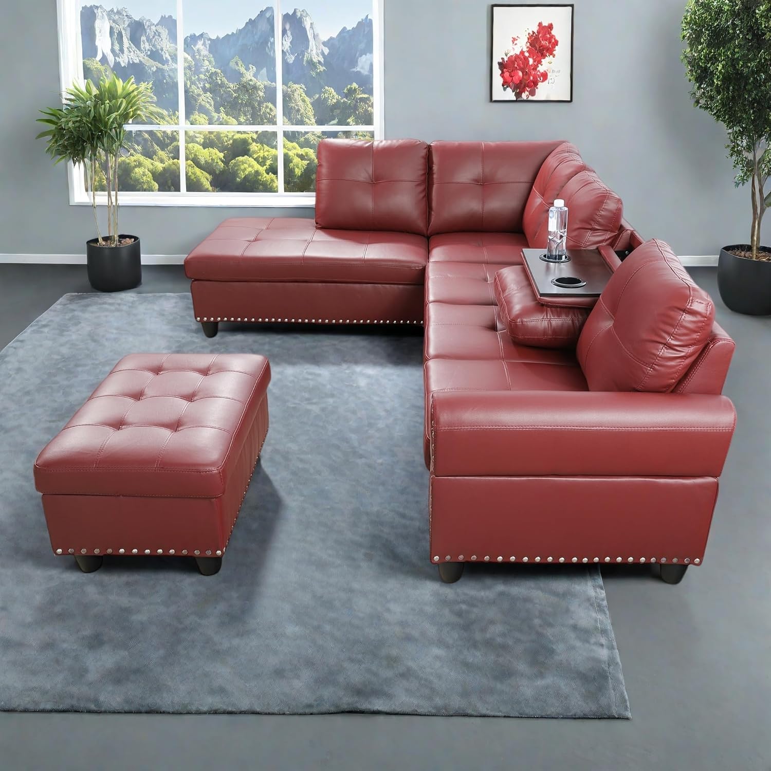 L-Shaped Sectional Sofa with Ottoman, Leather Modern Nail-Head Design with Cup Holder & Chaise for Living Room, Bedroom, Office, Red