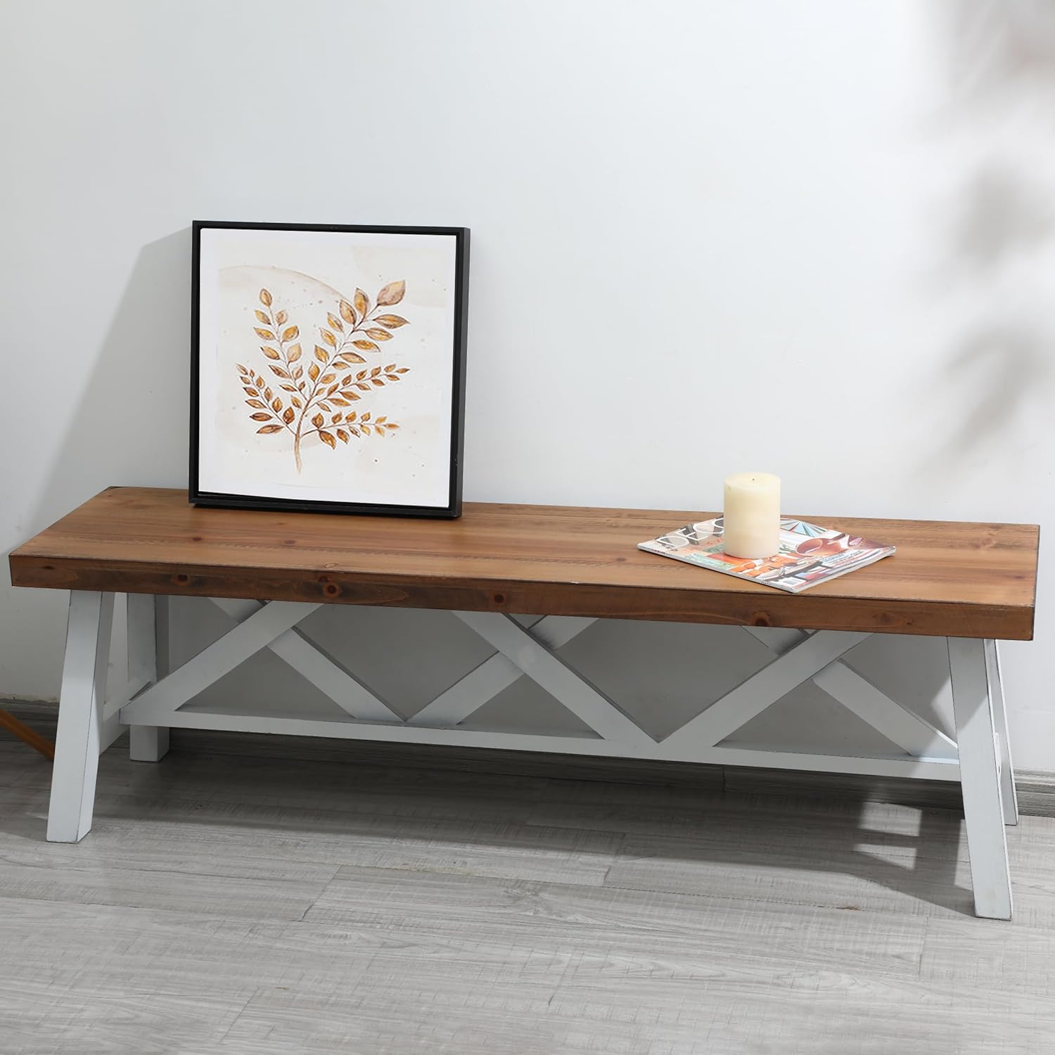 Wnutrees 54" Farmhouse Wood Bench, Rustic Solid Wood Entryway Bench Seat with Double X-Structure for Dining Room, Living Room, Hallway, Structural Stability, White