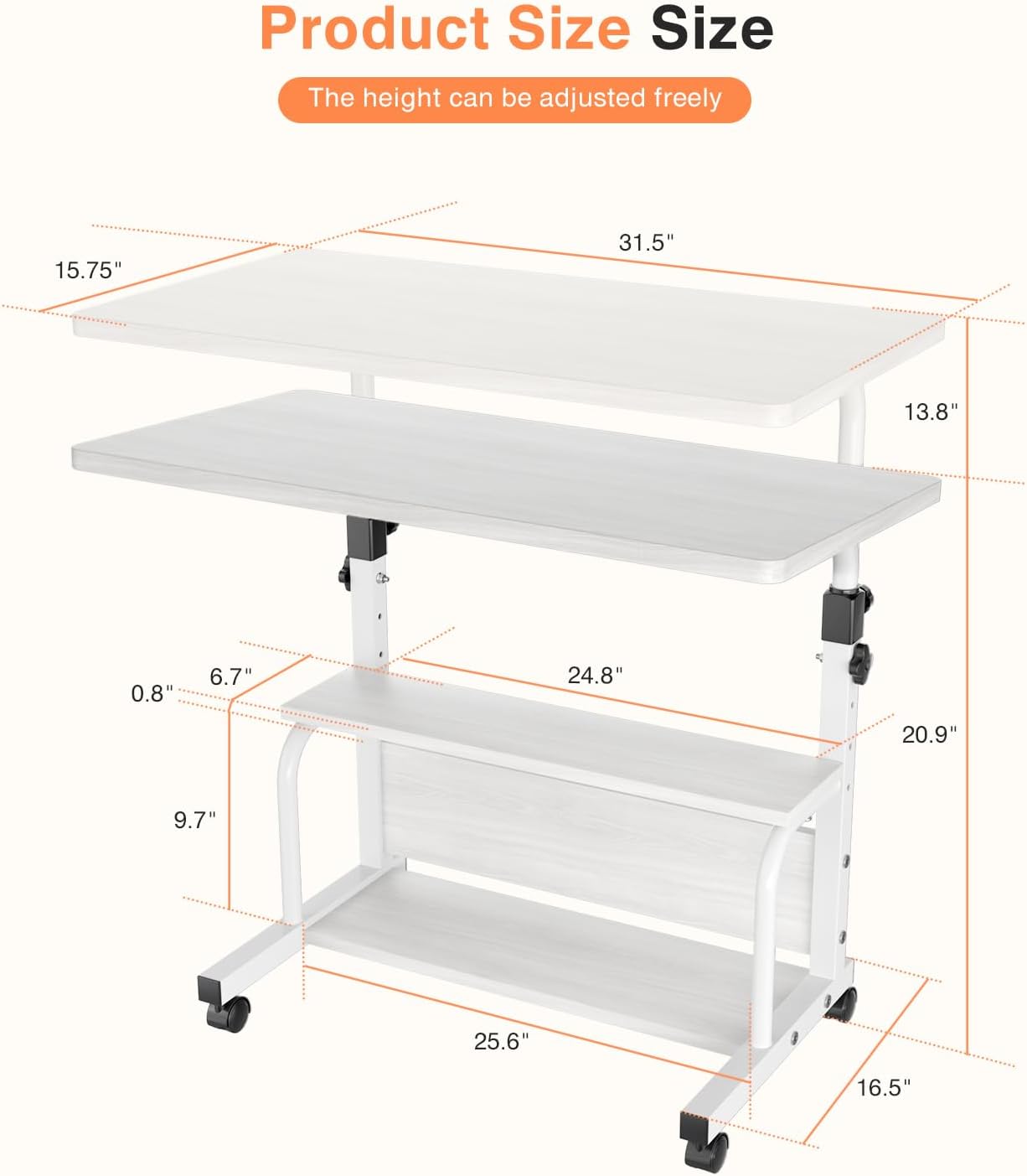 Portable Desk with Wheels Small Standing Desk on Wheels Adjustable Height Rolling Desks for Small Spaces, 32" Computer Desks with Storage Shelves for Home Office Study White