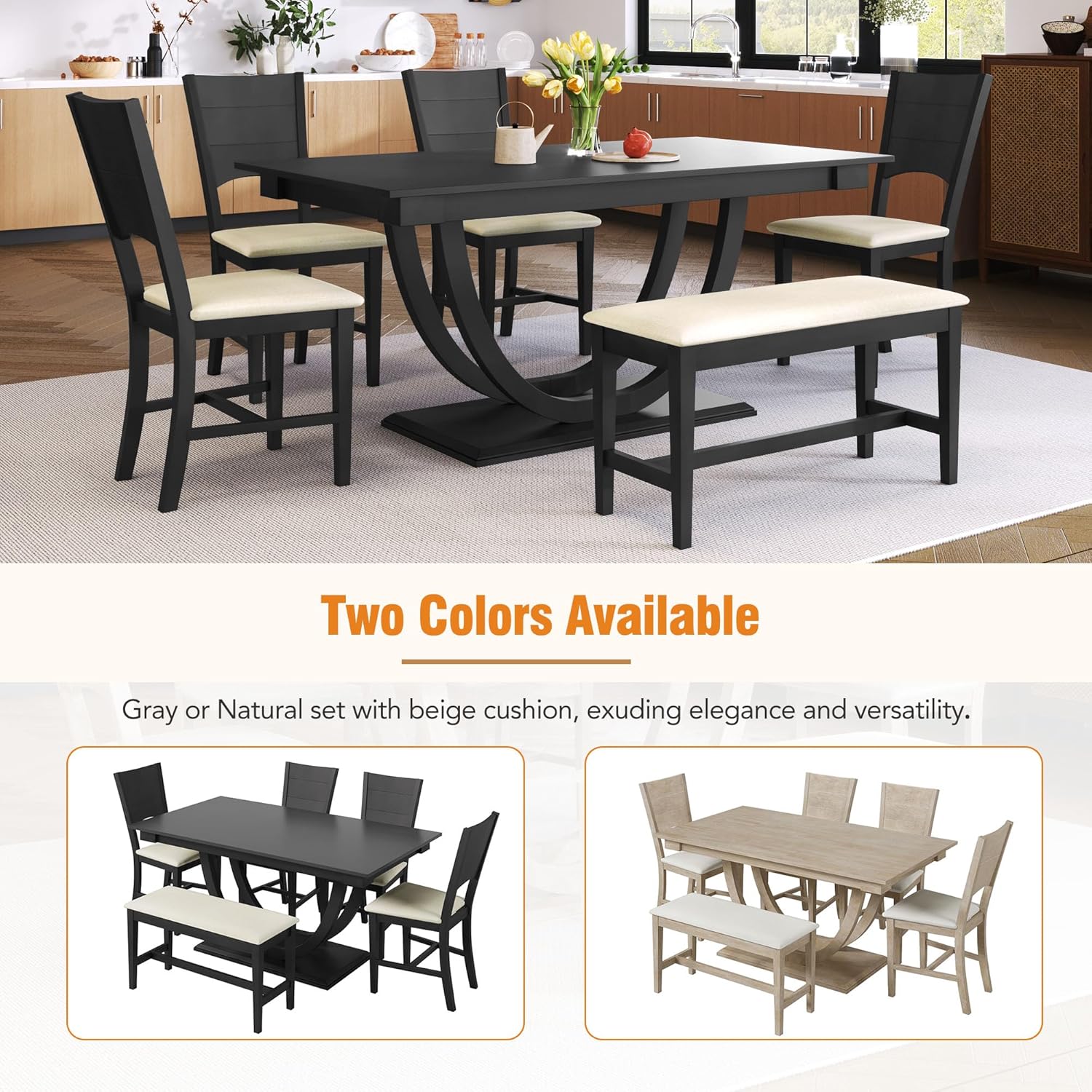 - [Modern Dining Set for 6] Experience a harmonious blend of modern and traditional design with our 6-piece solid wood dining set. This collection comprises a rectangular table, four chairs, and a bench, all uniquely distinguished by half-round table legs. Each chair and bench seat is lavishly padded, offering both comfort and style. Ideal for accommodating up to six, this set elevates your dining space, making a statement in any interior.