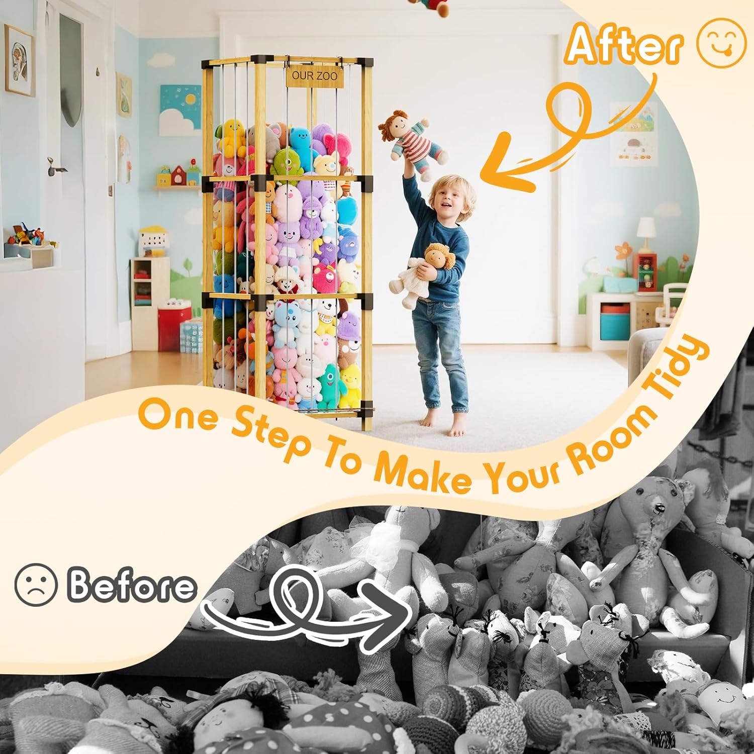 200L Stuffed Animal Zoo Storage, 3-Tier Extra Large Stuffed Animal Holder, Solid Bamboo Plushies Storage Tower with Mesh Pocket and Elastic Cords, Space Saver for Nursery Playroom Bedroom