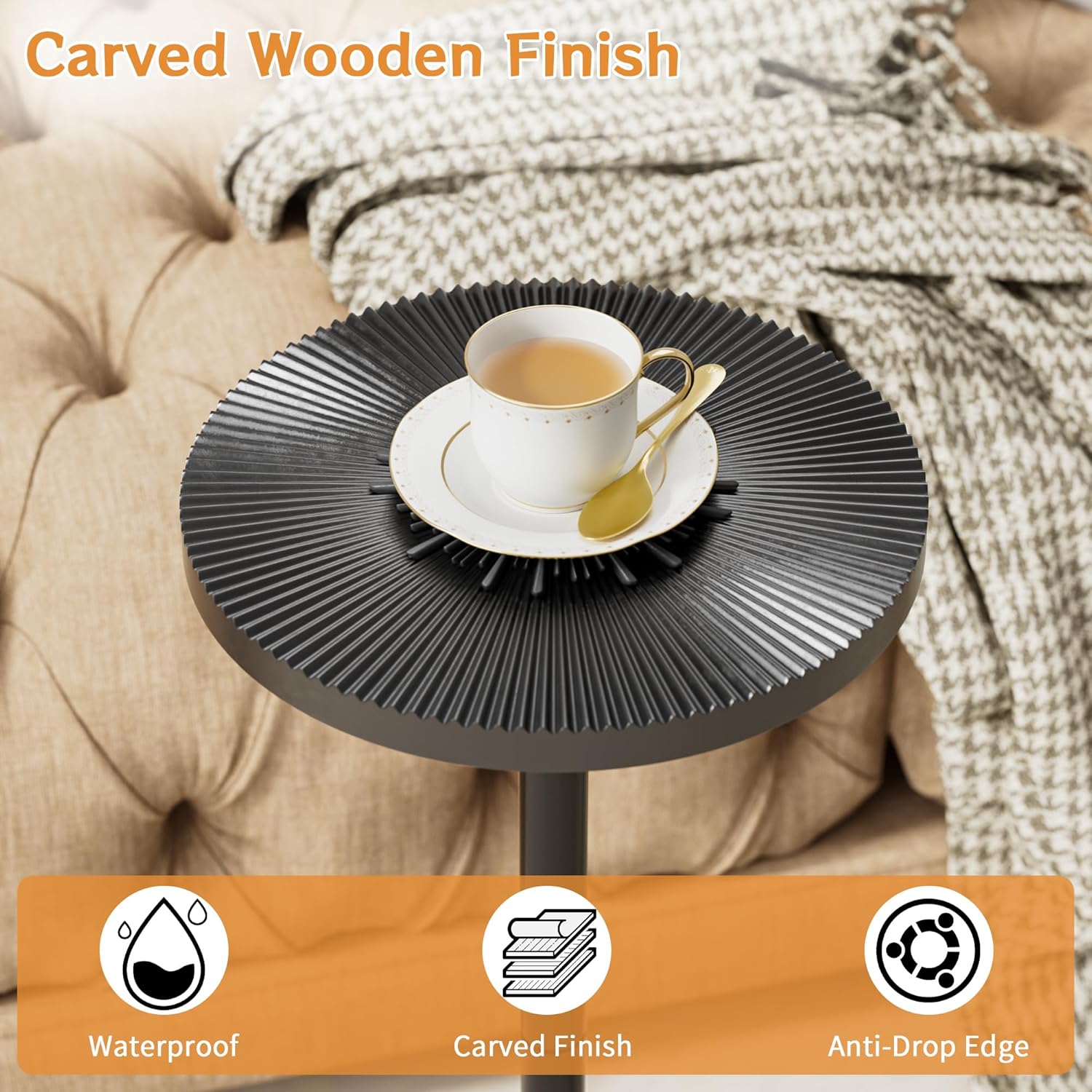 - Carved Side Table: This stylish and simple small side table features an exquisitely carved tabletop and base, as well as heavy matte metal legs. This round side table will complement any decor style and add a touch of elegance to your living room, bedroom or small space.