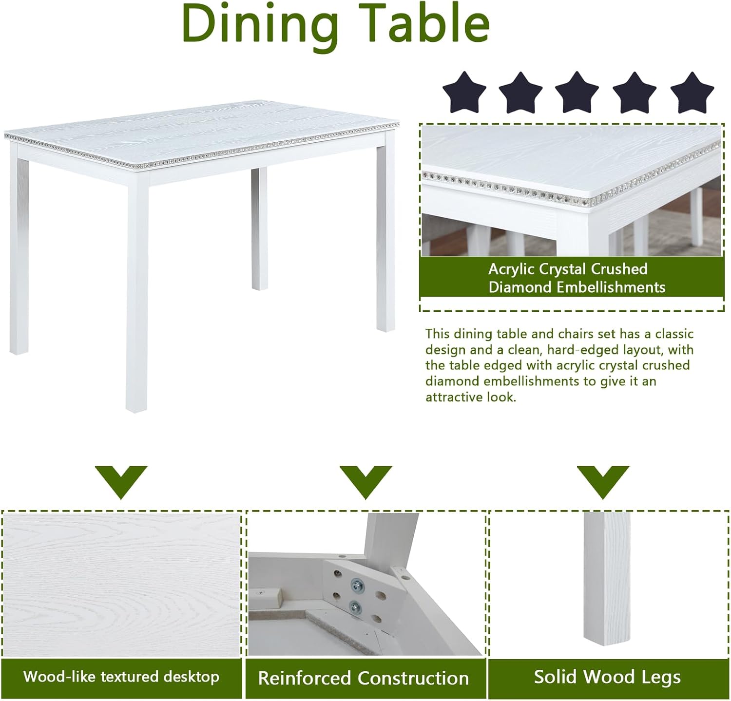 - 【Elegant Wooden Dining Table and Chairs】 This 5-piece dining table set features a sleek rectangular table with acrylic crystal crushed diamond edges, offering a refined and modern appearance. With clean lines and a balanced structure, it fits effortlessly into various interior styles, from contemporary to transitional spaces.