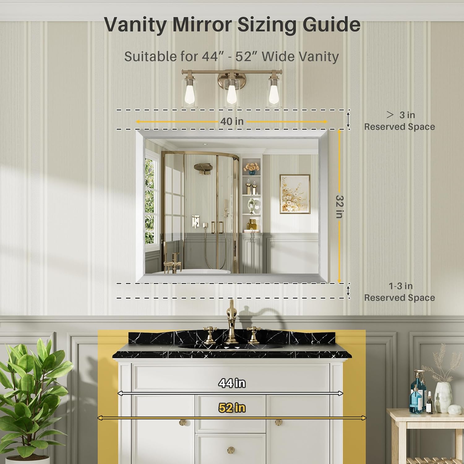 40x32 Inch Silver Bathroom Mirror for Wall, Thick Metal Framed Rectangle Mirrors for Over Sink, Bedroom, Living Room, Entryway, Anti-Rust, HD Tempered Glass