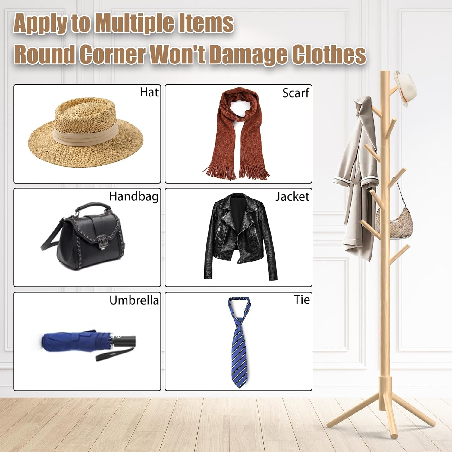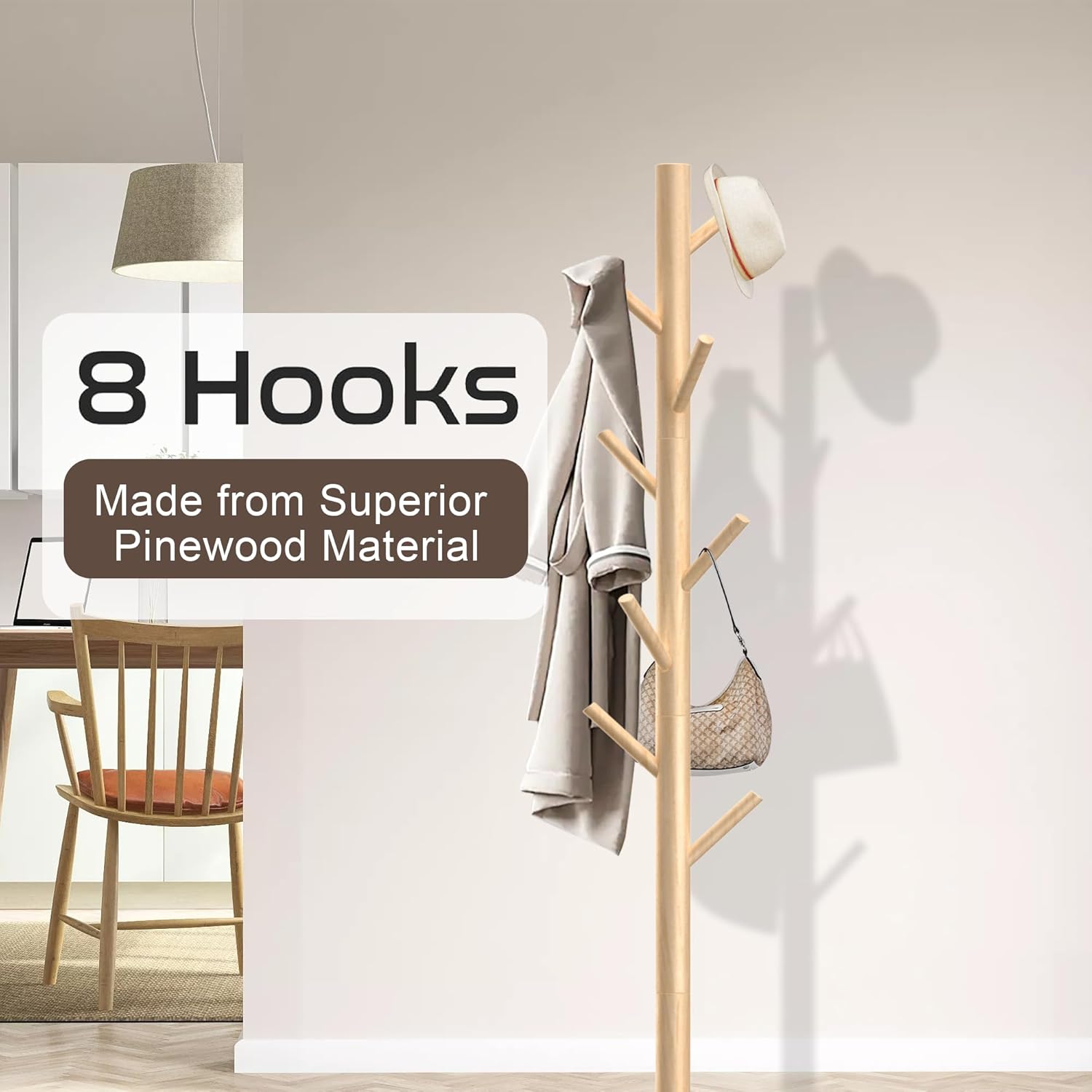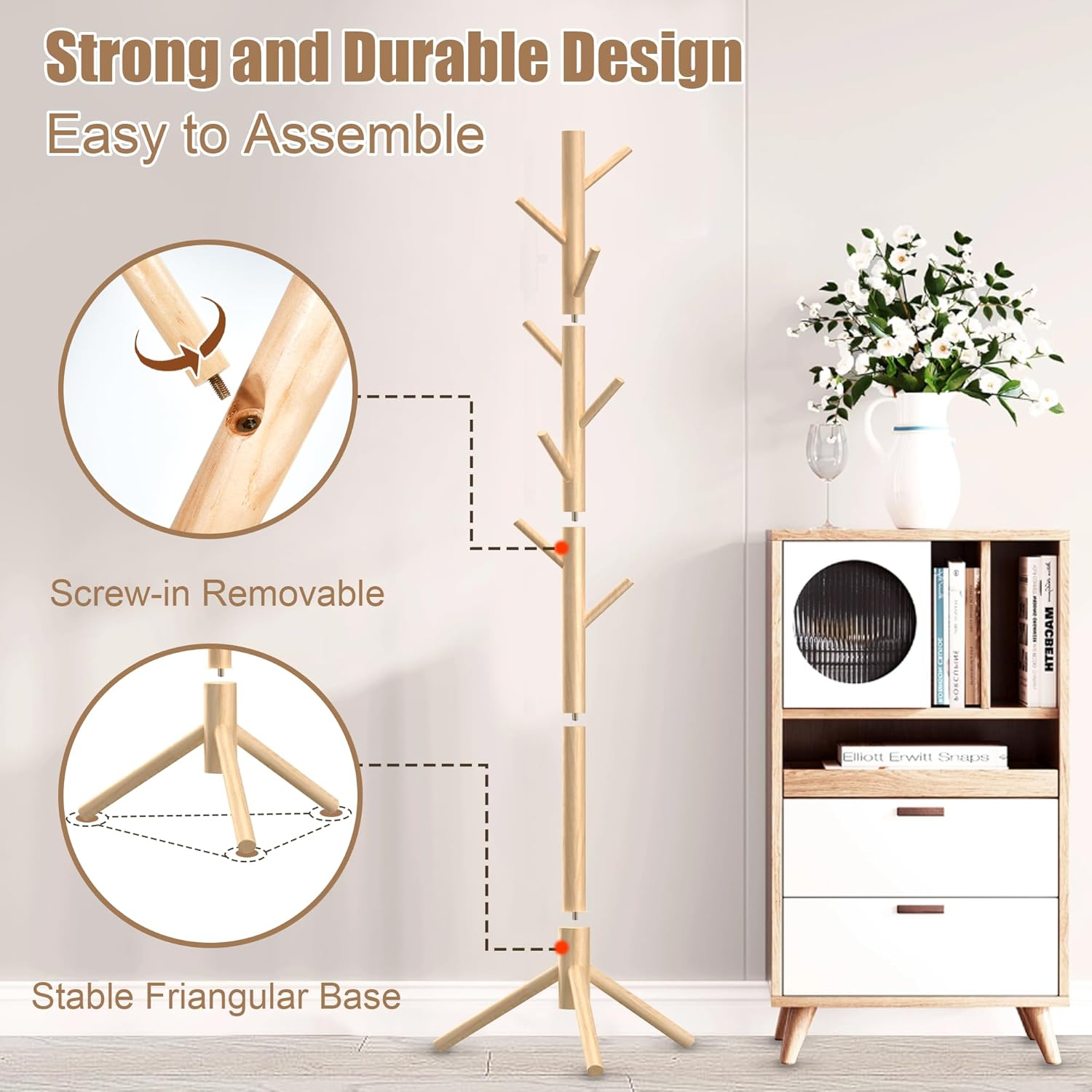 Wooden Coat Rack Stand, Freestanding Coat Rack with 8 Hooks, 3 Adjustable Size Coat Tree for Hats, Coats, Scarves bags, Coat Hanger Stand Used in Bedroom/Office/Entryway (Natural)