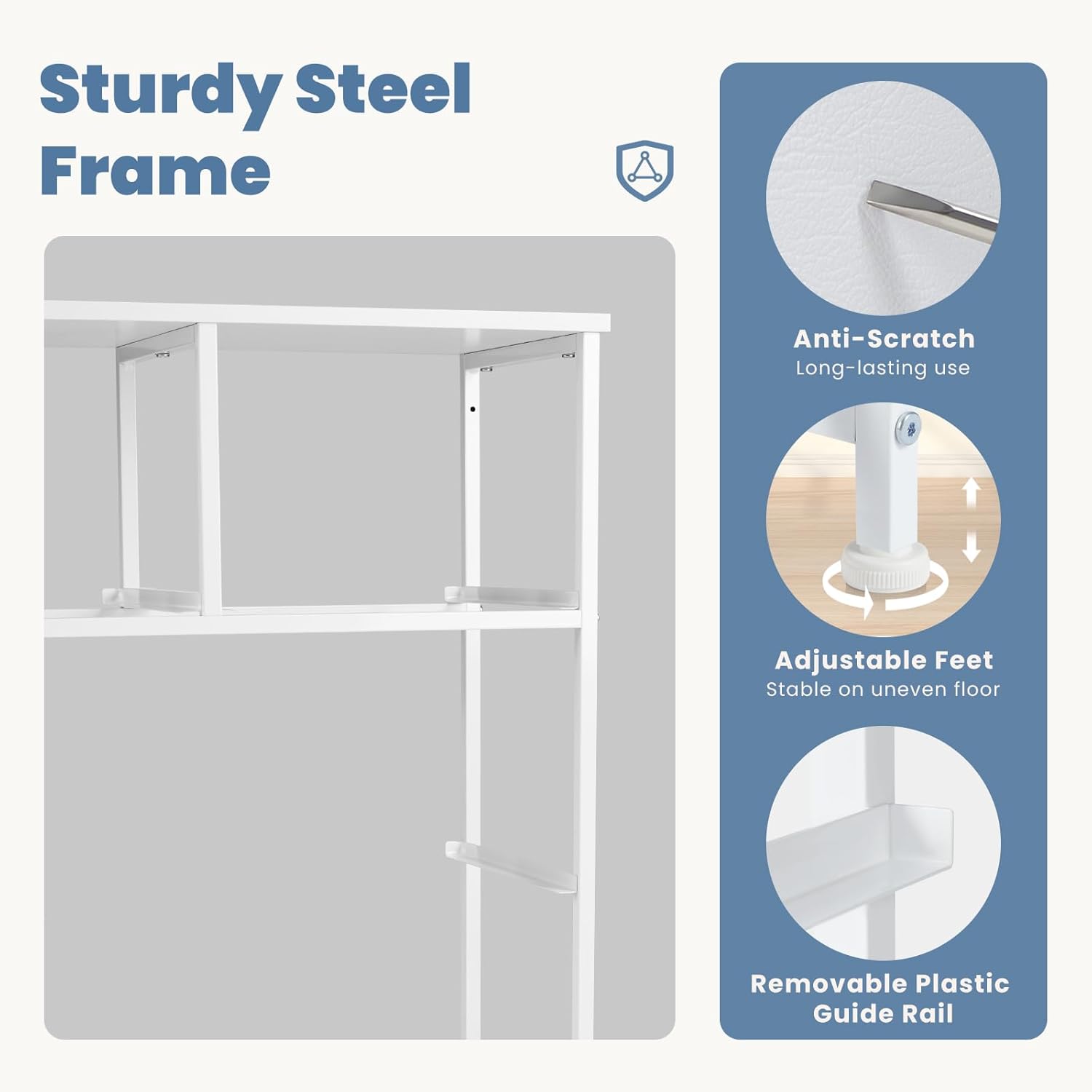 - 【Sturdy & Stable】This dresser is built with a sturdy metal frame to ensure stability. It is equipped with 4 adjustable feet to safeguard your floor from scratches, and you can effortlessly balance the dresser in tight spaces. Moreover, it comes with an anti-tilt device that can be utilized when mounting the dresser to the wall, preventing accidents caused by uneven floors or Guest climbing.