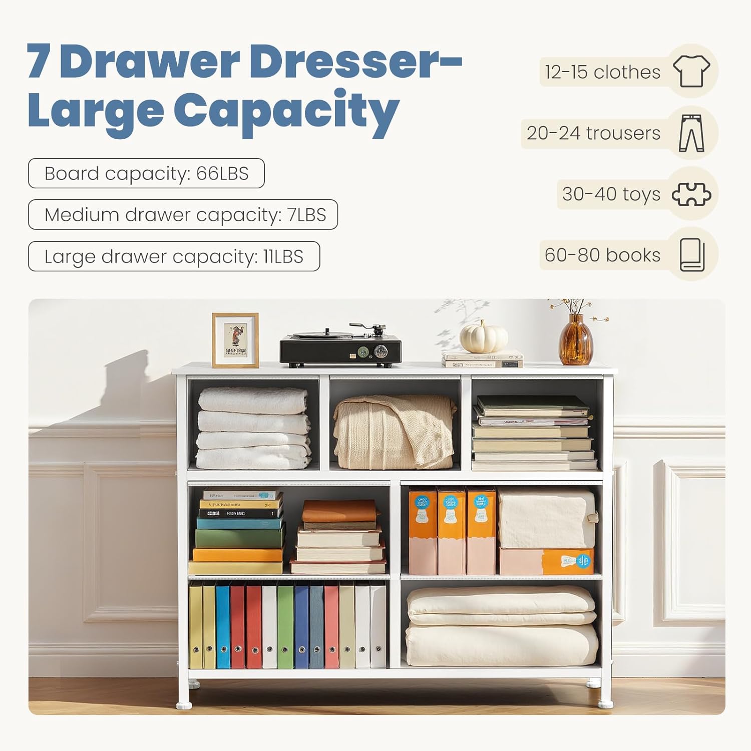 - 【Attention to the FULL-size】This bedroom dresser features fabric bins, providing space-saving storage for magazines, adult or Guest's clothing, books, and more. The wooden top board can support up to 66 pounds and can even serve as a TV stand. Please confirm the dimensions of this 7-drawer dresser: 39"D x 11.8"W x 30"H.