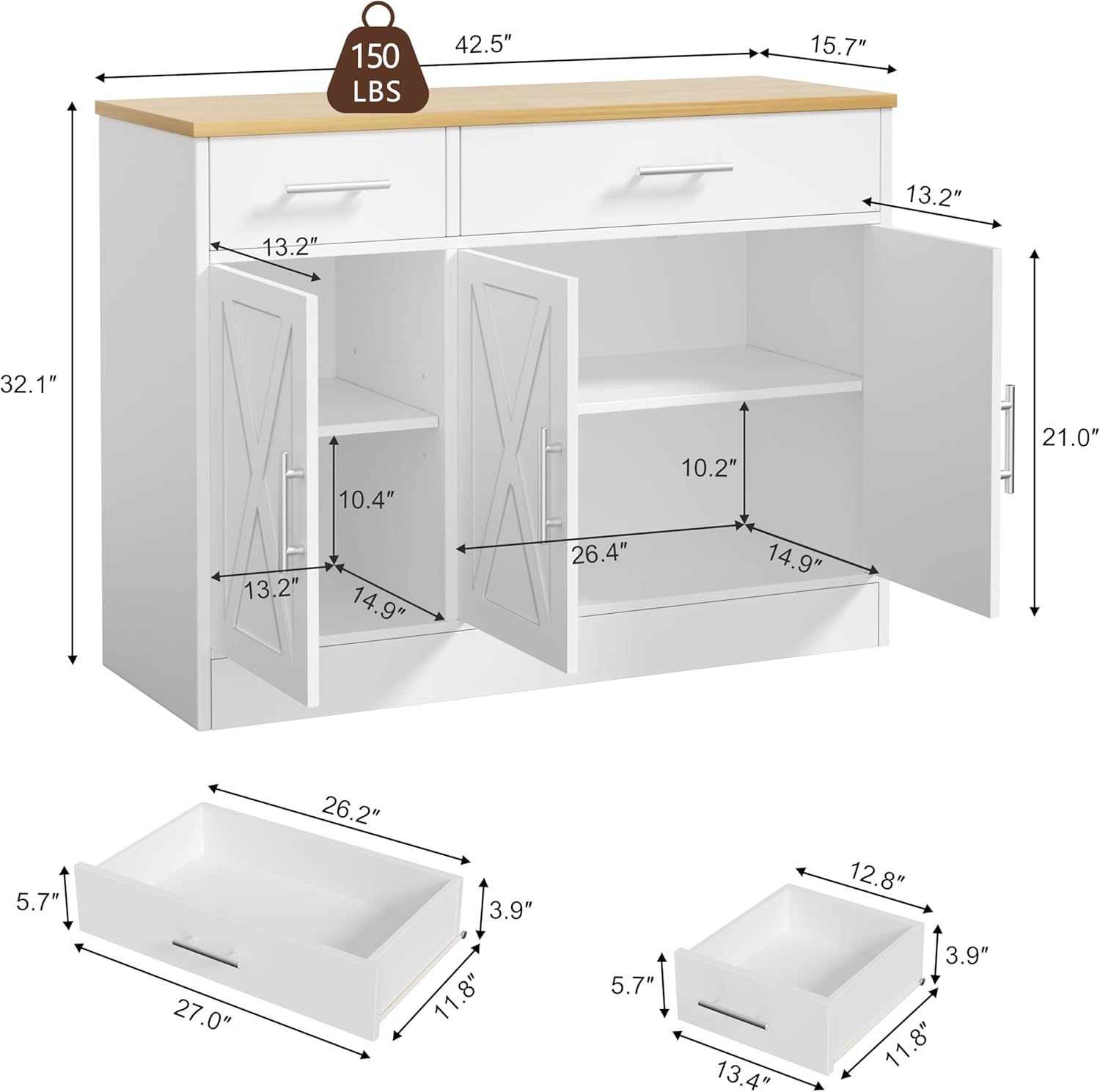 - Quality Material Buffet Cabinet: This sideboard buffet cabinet is crafted from premium manufactured wood and hardware, the buffet cabinet performs excellent stability and incredible durability to serve for years. The tabletop supports up to 180lbs. Overall Dimensions: 15.7"D x 42.5"W x 32.1"H.