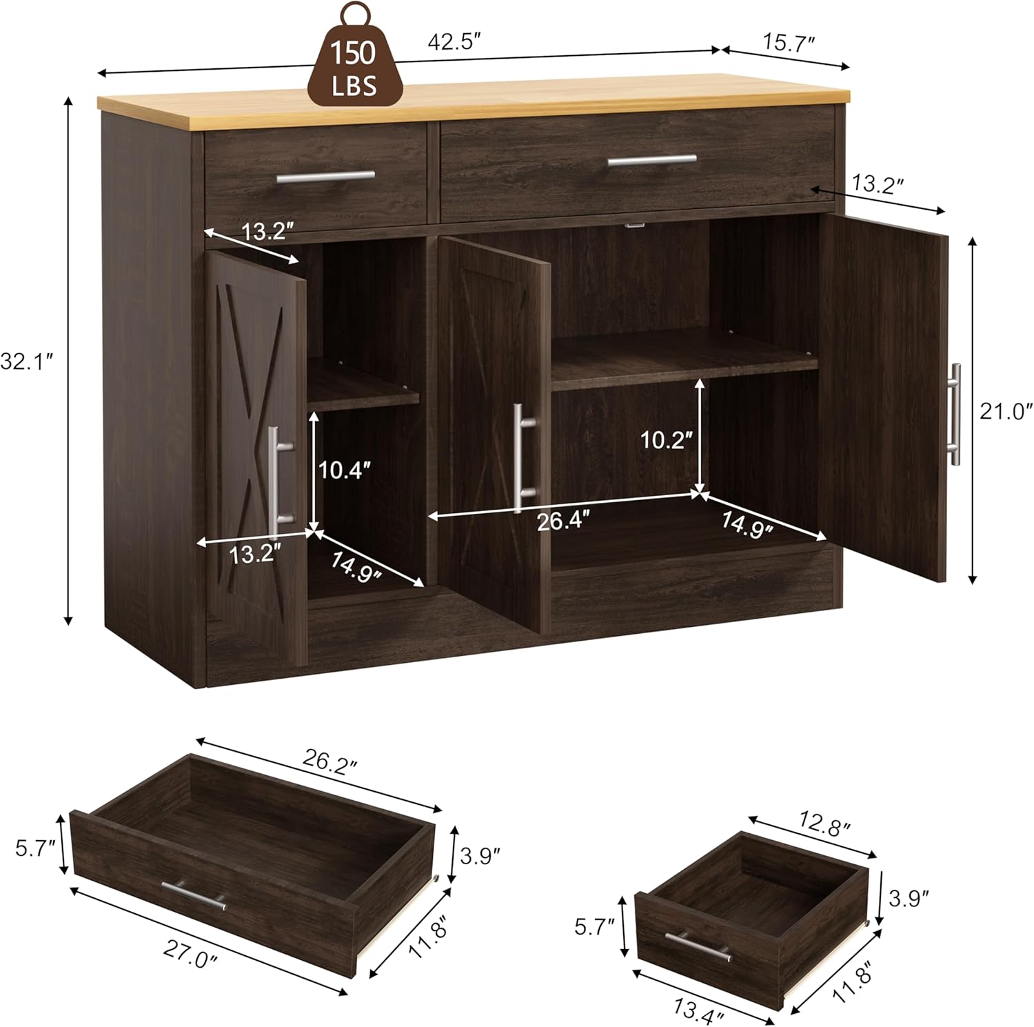 - Quality Material Buffet Cabinet: This sideboard buffet cabinet is crafted from premium manufactured wood and hardware, the buffet cabinet performs excellent stability and incredible durability to serve for years. The tabletop supports up to 180lbs. Overall Dimensions: 15.7"D x 42.5"W x 32.1"H.