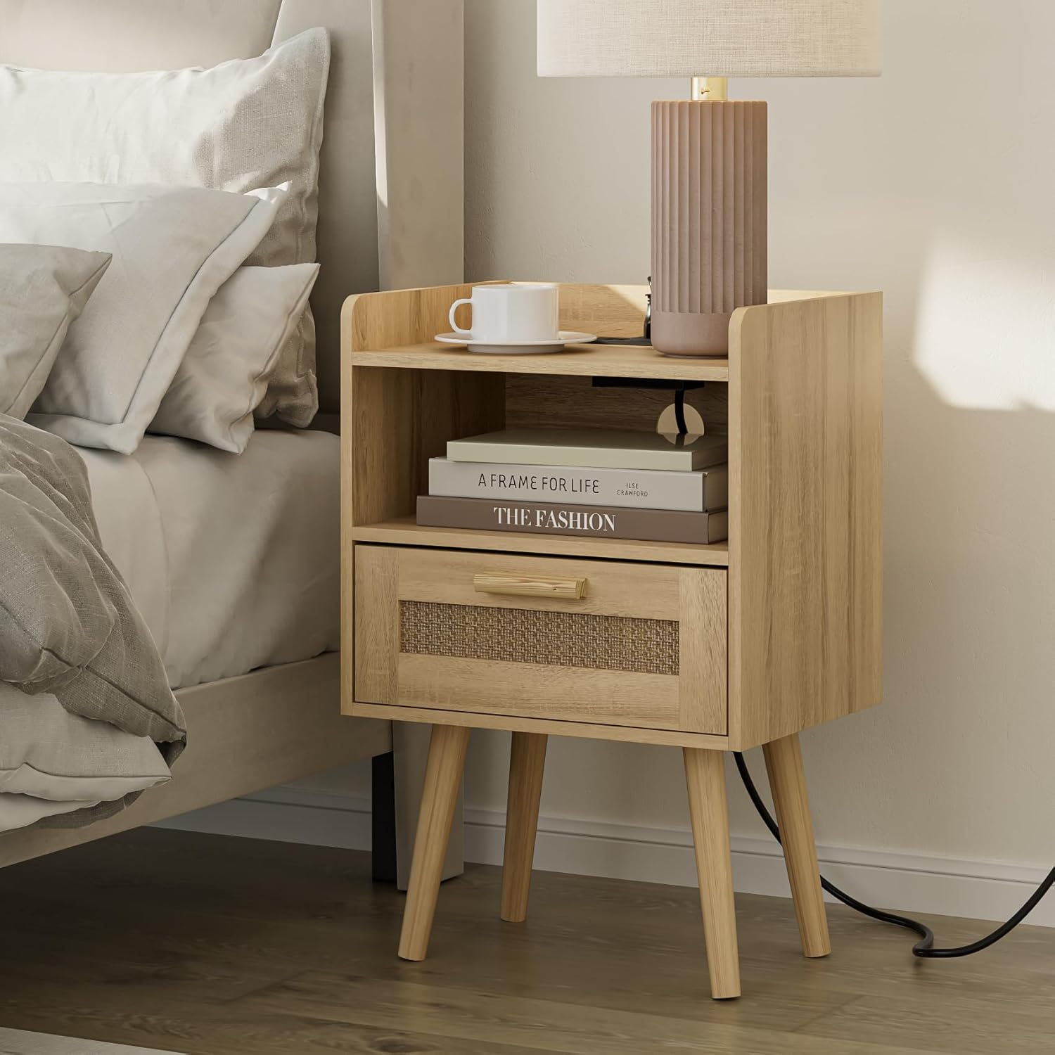 - Multi-scenario Use: This side table has one drawer and one open shelf in the middle. The anti-drop baffle design provides perfect storage space for your desk lamp, remote control, and mobile phone. Unique rattan edge texture, it is the best gift for your relatives and friends