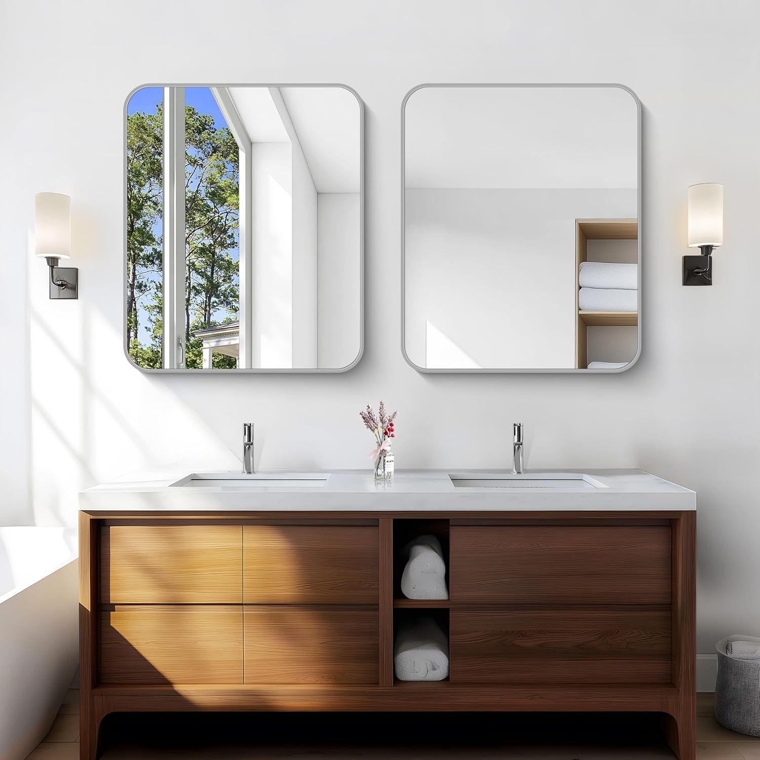 Silver Bathroom Mirror, 30 x 36 Inch Metal Framed Silver Rectangle Mirror, Rounded Corner Rectangular Vanity Mirror, Wall Mounted Mirror for Living Room Bedroom Entryway Horizontal/Vertical