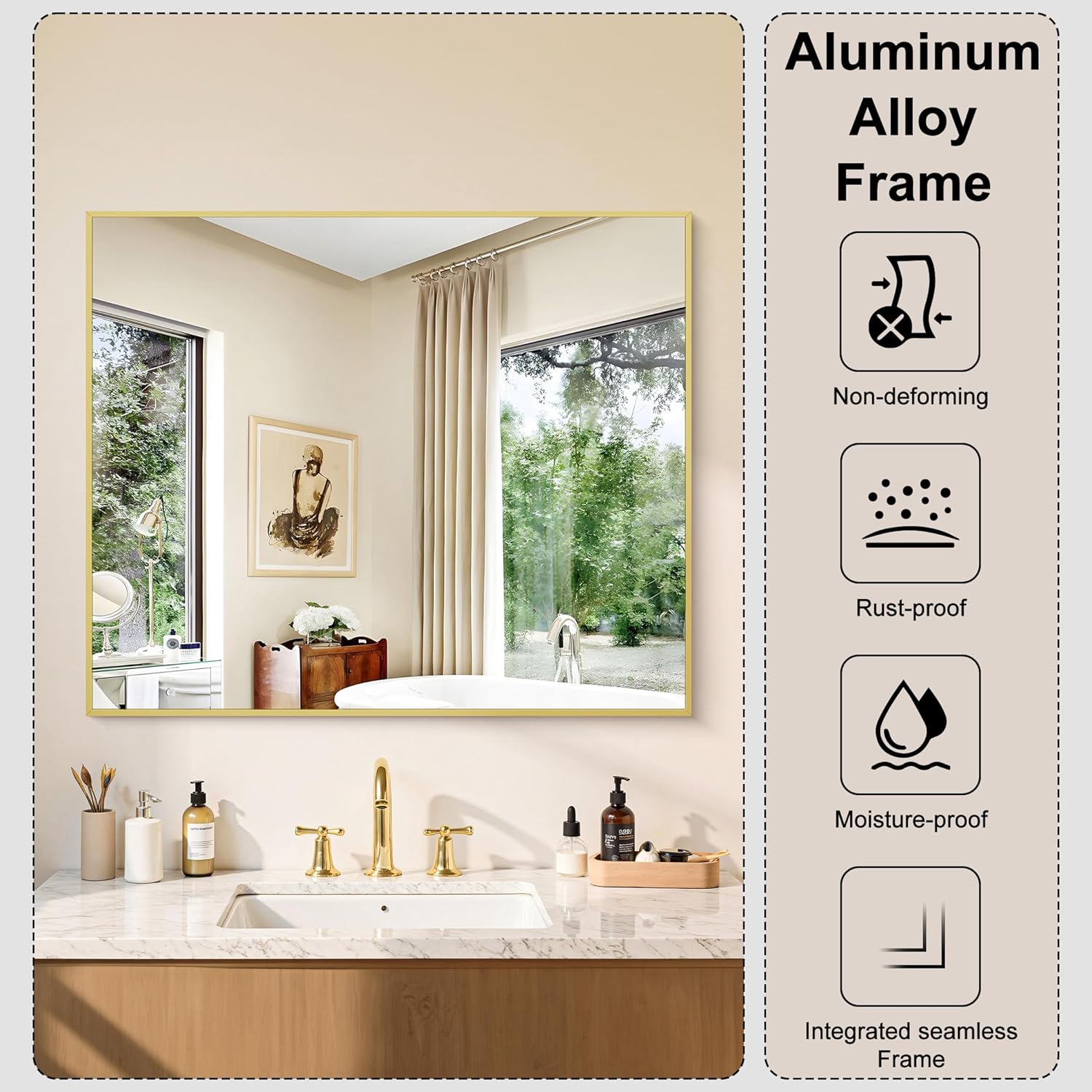 - Exceptional Quality:KOCUUY gold wall mirror is made of HD 3mm premium glass, shatterproof, bright and anti-distortion, which provides perfect reflection. Durable Aluminum alloy frame would strengthen the floating glass for safety, waterproof and anti-corrosion in wet bathroom environments