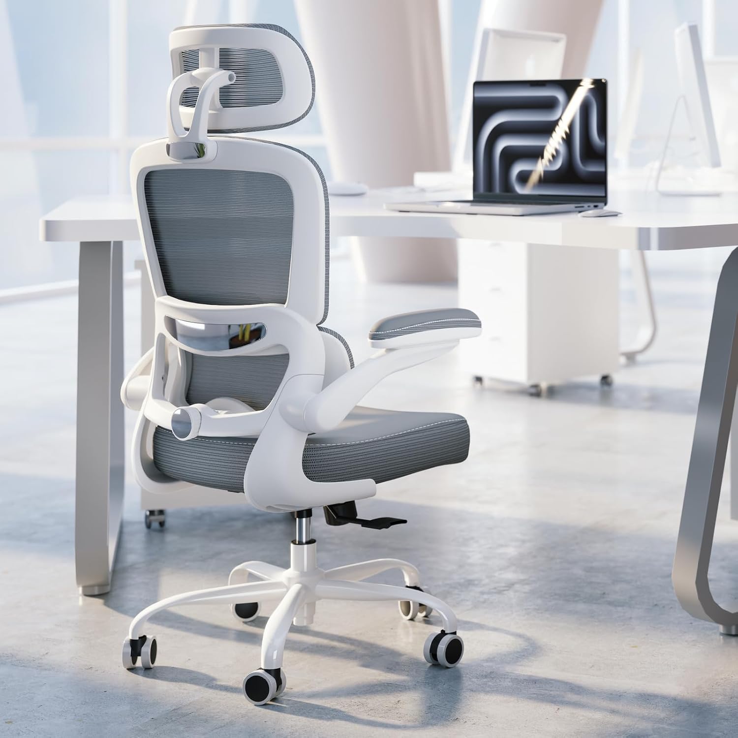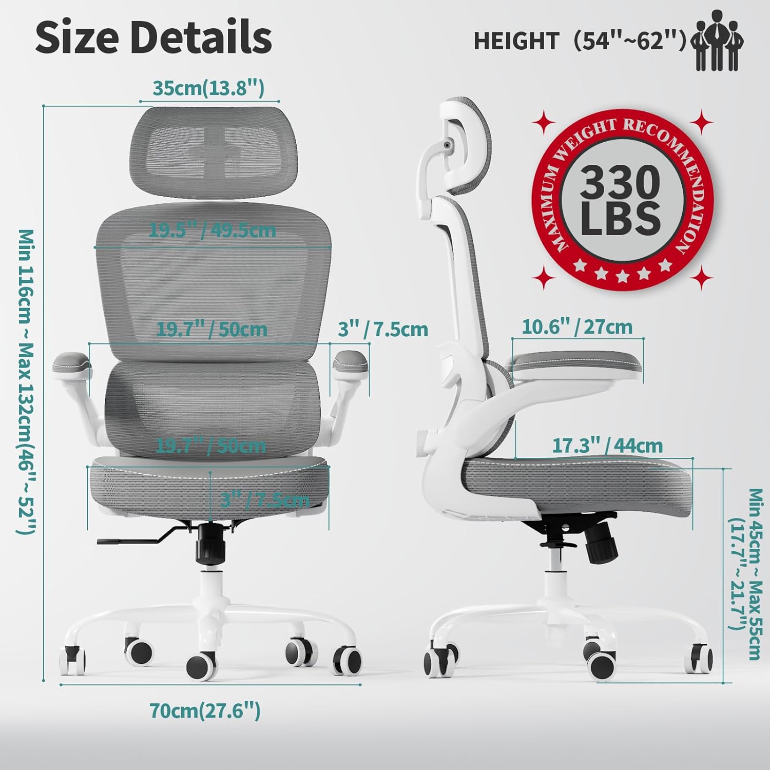 - ERGONOMIC SUPPORT: TRALT ergonomic office chair for back pain relief is a desk chair comfy enough for long hours, featuring adjustable lumbar support and headrest to promote natural posture. A wider seat (20" W x 17.3" D x 18.5"-21.3" H) helps distribute weight evenly, suitable for people of about 5'5" to 6'2". Flip-up armrests make it a comfy chair for small spaces