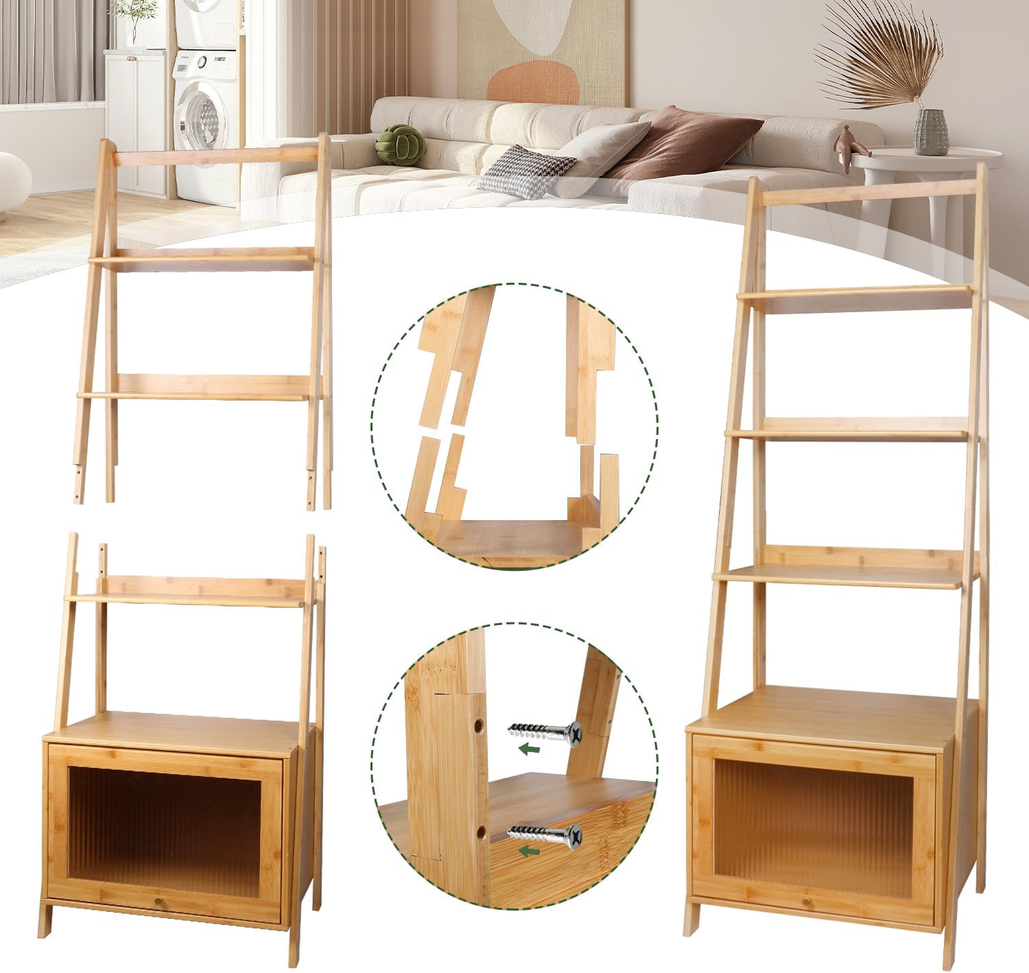 - [Designer-approved Beauty] This chic and stylish bamboo ladder bookshelf has clean lines + natural bamboo pattern, and the bottom organizer with metal door knobs easily transforms between different styles: → Bohemian bedroom with Magnila lace → Industrial loft with Edison bulbs → Scandinavian style home office