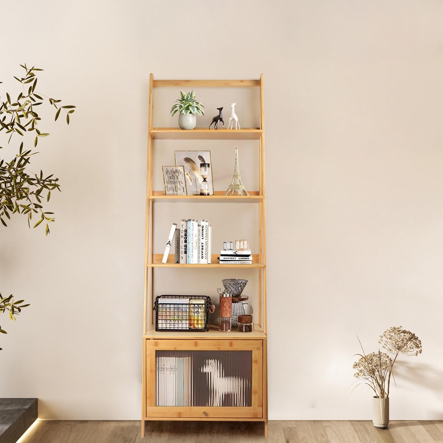 5-Tier Bamboo Ladder Bookshelf with Flip-Up Storage Cabinet - Large Capacity Mid Century Modern Bookcase, Space Saving Accent Furniture Open Display Rack Shelf for Bedroom Living Room Home Office