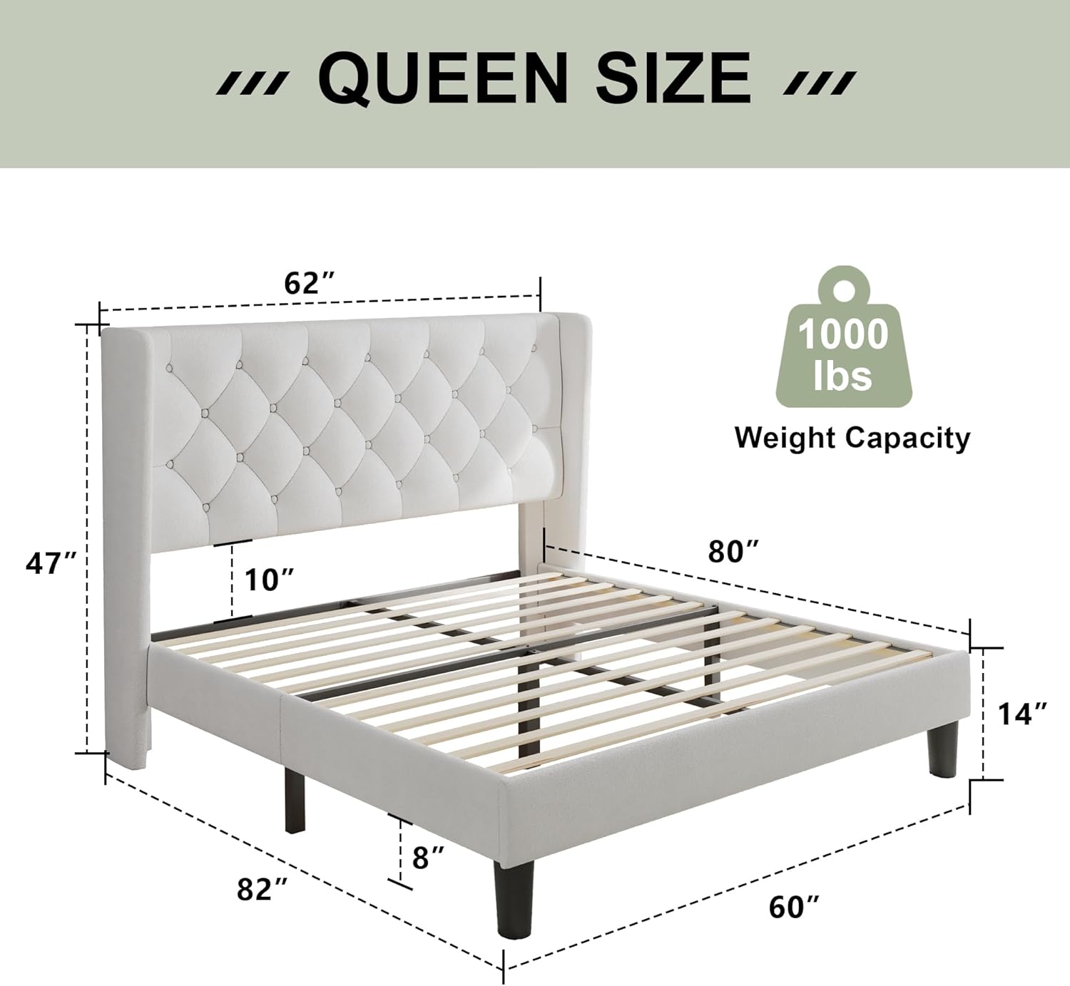 Feonase Queen Size Bed Frame with Diamond Tufted Wingback Headboard, Upholstered Platform Bed, Sturdy Wooden Slats Support, Noise-Free, No Box Spring Needed, Easy Assembly, White