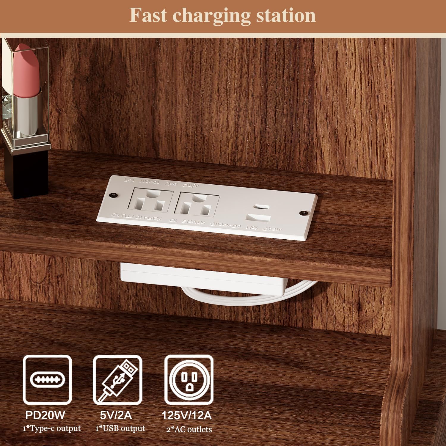 - 【Built-in Power Strip】Upgrade design!This makeup table equipped with a power strip that has 2 standard plug sockets ,1 USB ports and 1 T-C with a 4.9-foot power cord,convenient for the LED lights,hairdryer, curling iron, and charge your phone, tablet, or other electronics.