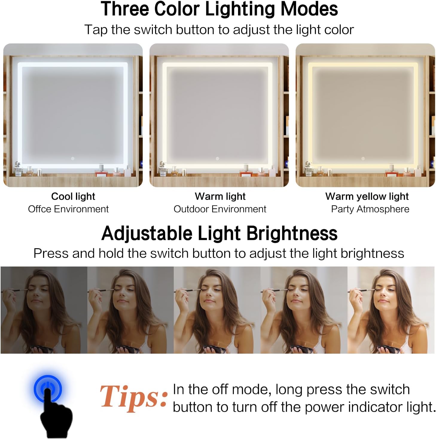 - Vanity with Lights: makeup vanity features a high-definition makeup mirror with LED light. It has 3 different color modes (cool light, natural light, warm light) and the brightness of each light color. Makeup vanity freely meets your makeup needs for different occasions.