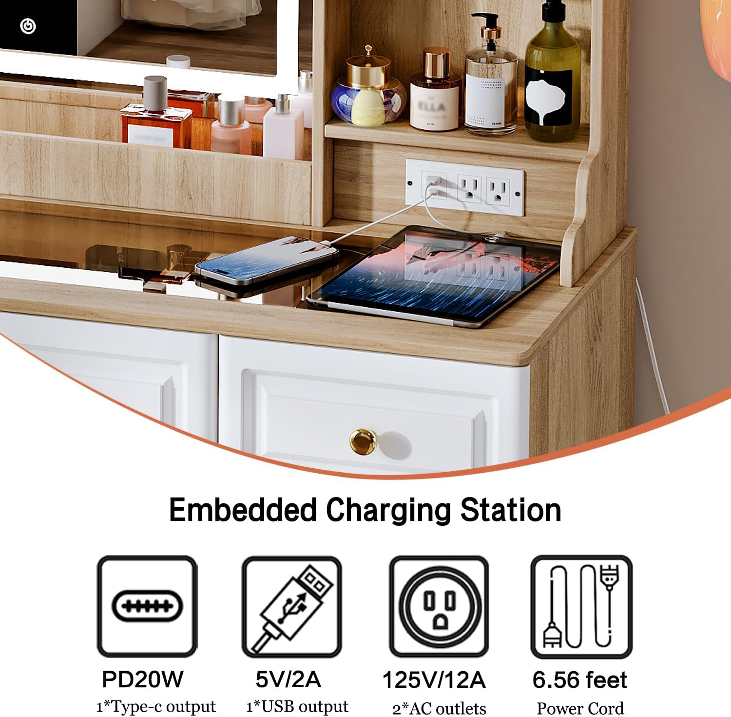 - 【Built-in Power Strip】Upgrade design!This makeup table equipped with a power strip that has 2 standard plug sockets ,1 USB ports and 1 T-C with a 4.9-foot power cord,convenient for the LED lights,hairdryer, curling iron, and charge your phone, tablet, or other electronics.