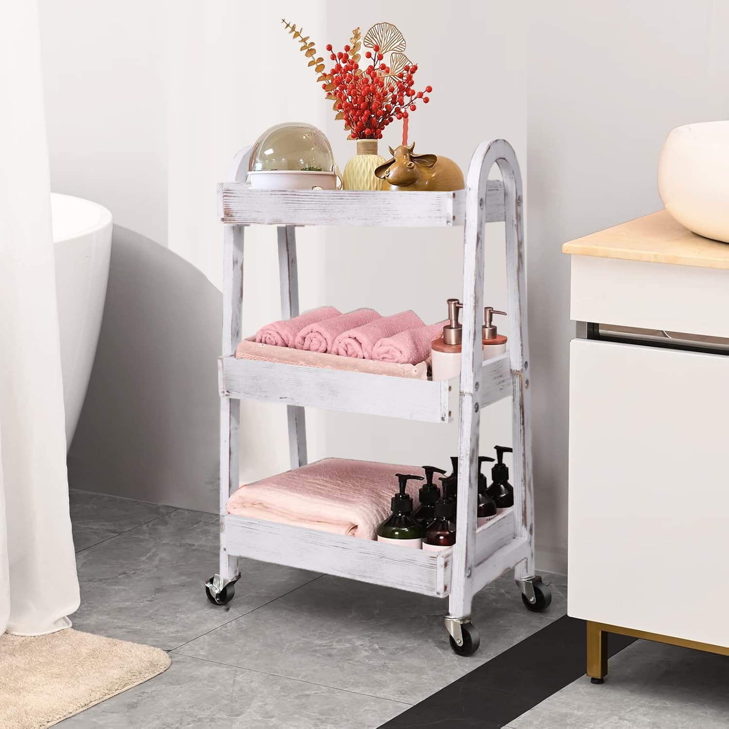 - 【Wide Usage】Wooden cart on wheels is easy storage and transportation as a art cart, bathroom cart, bar cart, craft cart,baby room cart,organization rack,serving cart, storage shelves, tools cart, etc.It is best gift of baby birthday,happy wedding anniversary ,baby shower souvenir gifts,bridal shower return gifts.