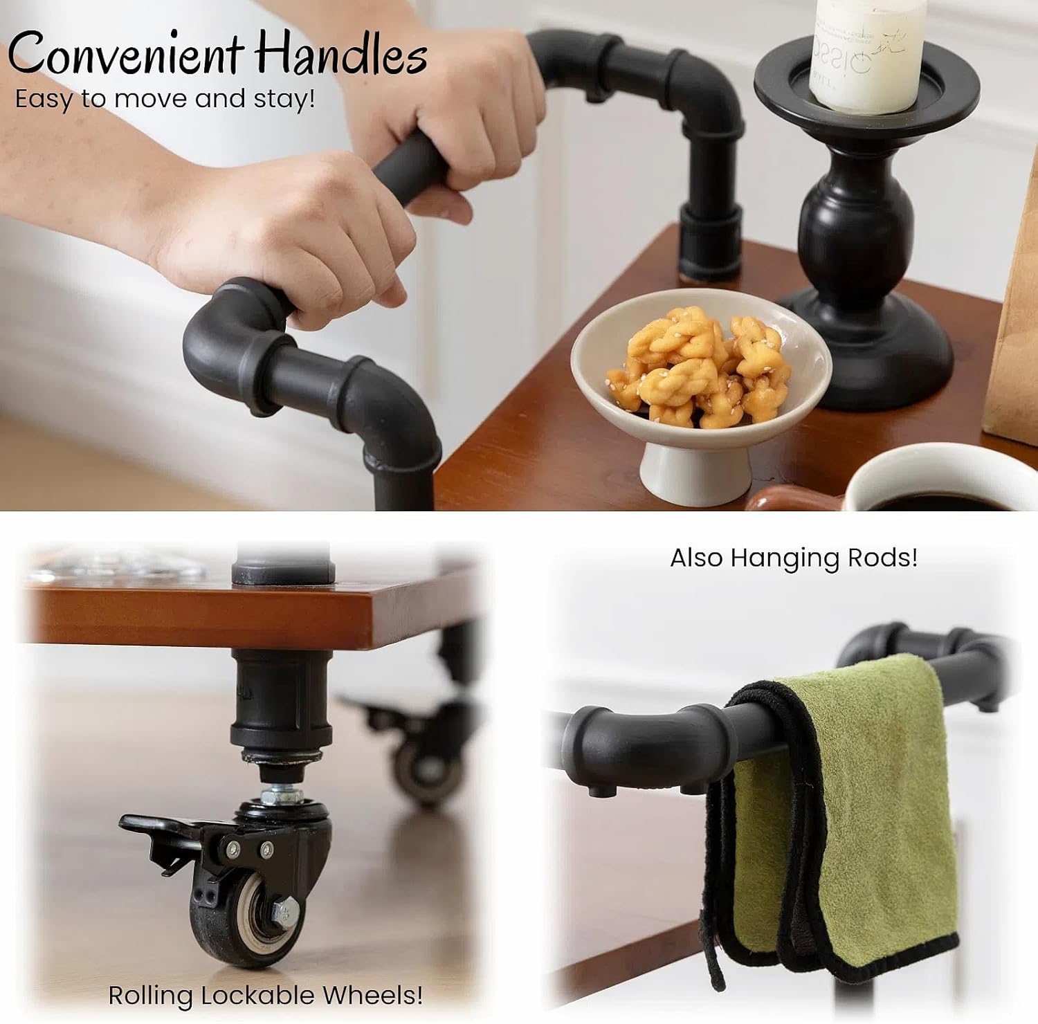 - 5. [What You Get] - A kitchen bar cart made of sturdy solid wood with a metal pipe frame. It has storage shelves, two functional handles and four rolling lockable wheels. Let this cart help you in the kitchen!