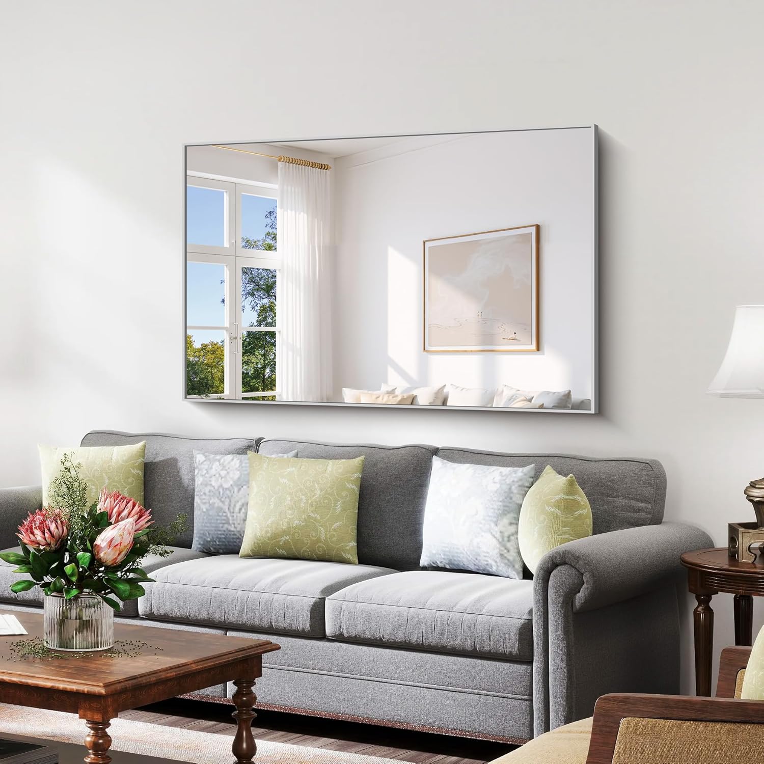 YIROMAN Bathroom Mirror 55"x36", Large Brushed Silver Bathroom Mirror for Over Sink with Aluminum Frame, Rectangular Vanity Mirror with Right Angle, Wall Mirror Hangs Horizontal or Vertical