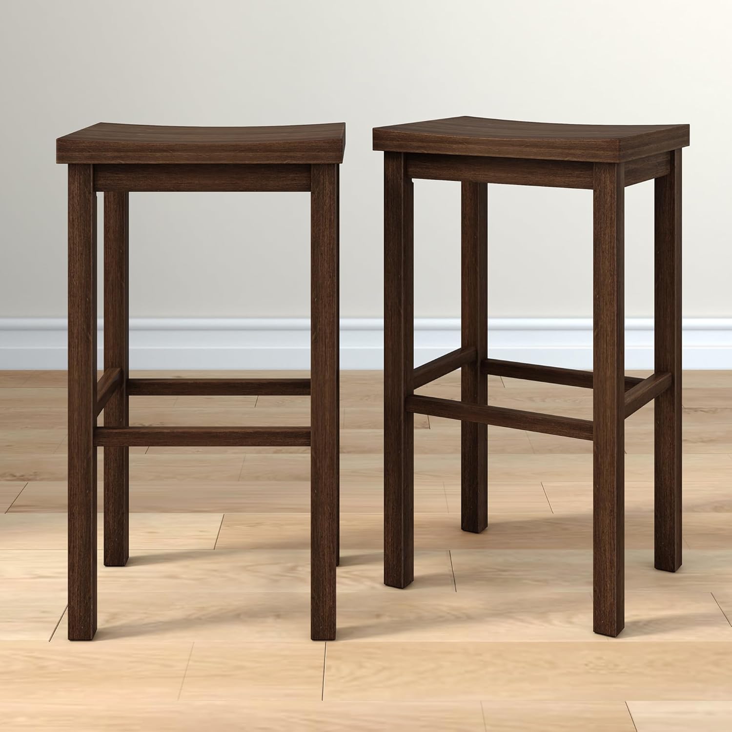 Grain & Grove Smith Collection Set of 2 Solid Wood Bar Stools, 30 inch Saddle-Seat Bar Chairs, Backless, Heavy-Duty Construction, Footrest Support, for Kitchen Islands, Home Bars, and Counters, Walnut