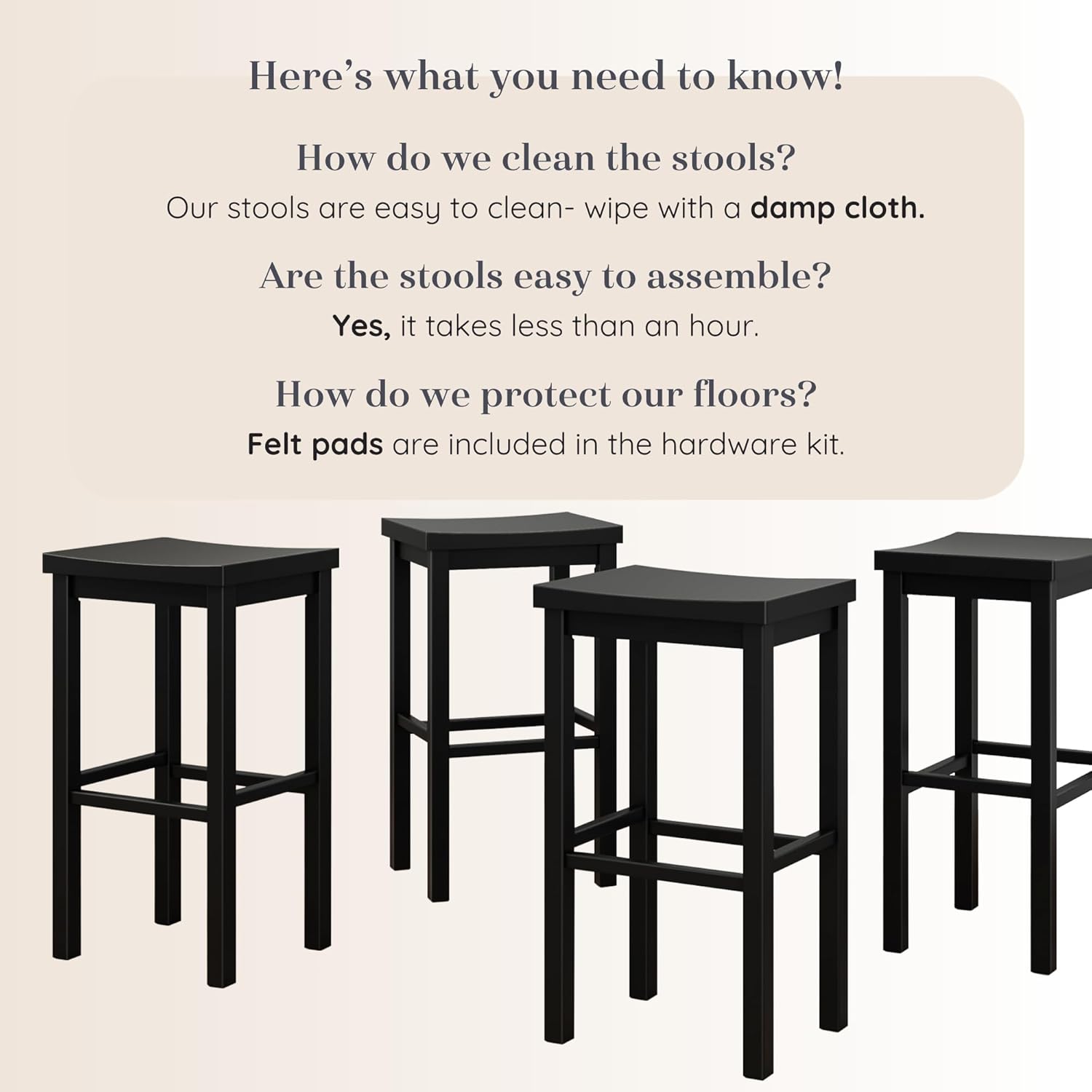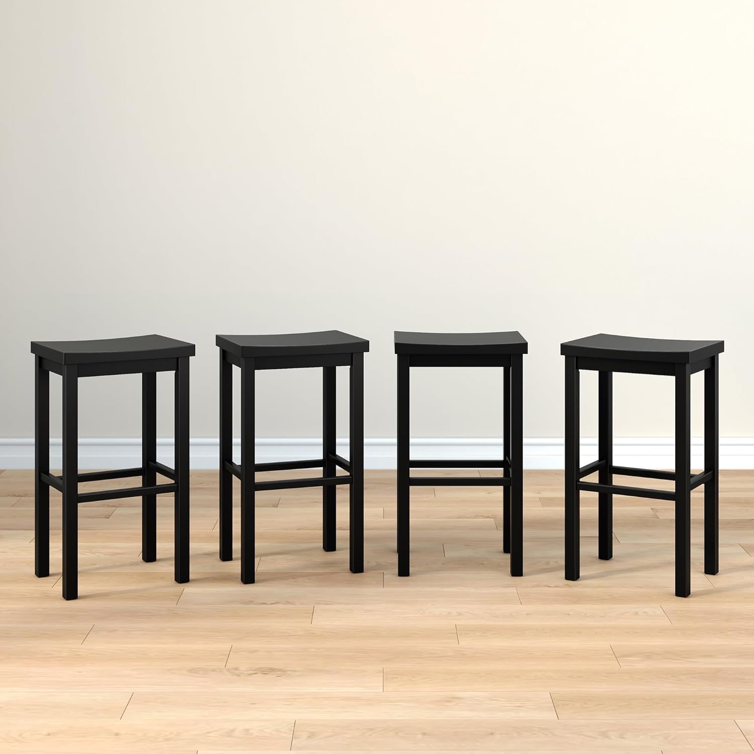 Grain & Grove Smith Collection Set of 4 Solid Wood Bar Stools, 30 inch Saddle-Seat Bar Chairs, Backless, Heavy-Duty Construction, Footrest Support, for Kitchen Islands, Home Bars, and Counters, Black