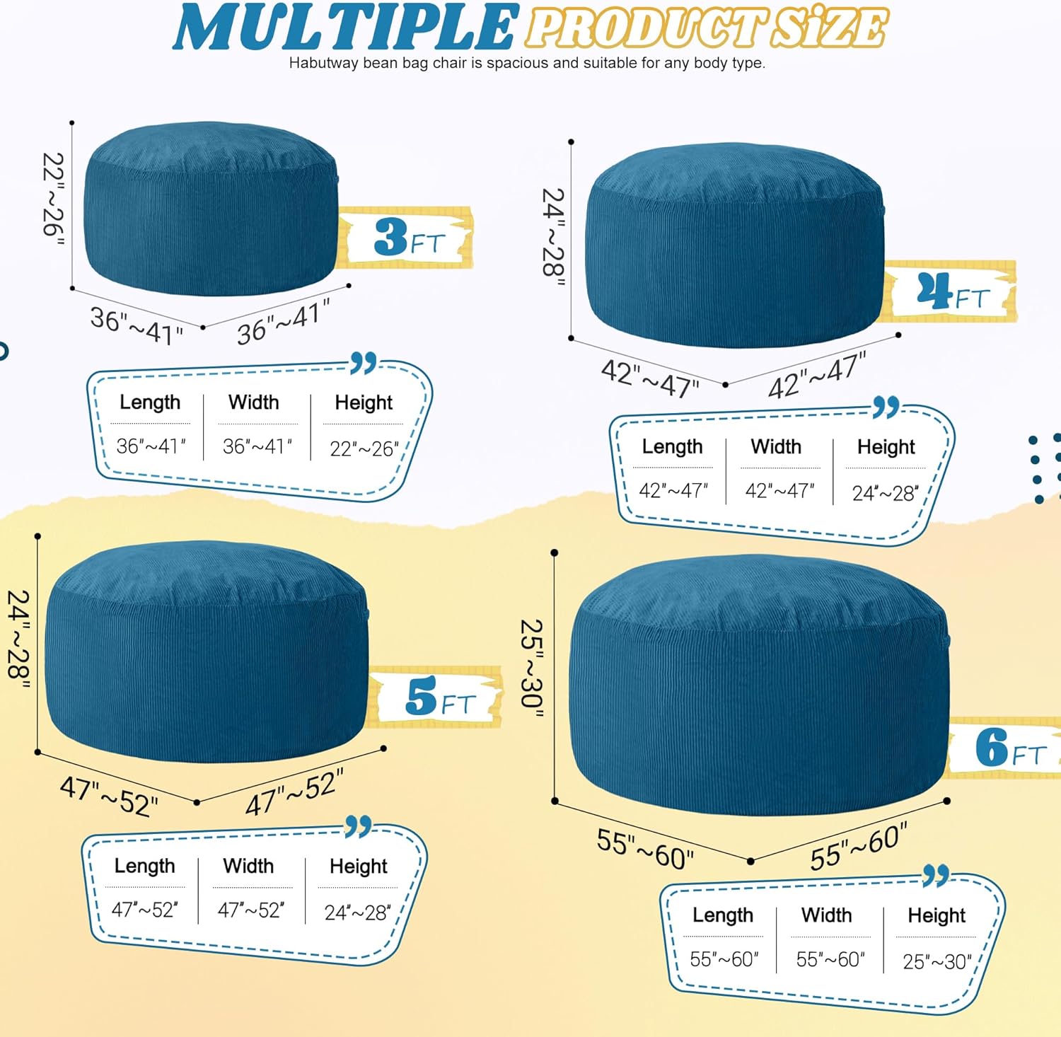 HABUTWAY 5FT Bean Bag Chair,Giant Bean Bag Chairs for Adults,Big Bean Bags with Memory Foam Filled, Large Beanbag Chairs with Soft Corduroy Cover-Dark Blue