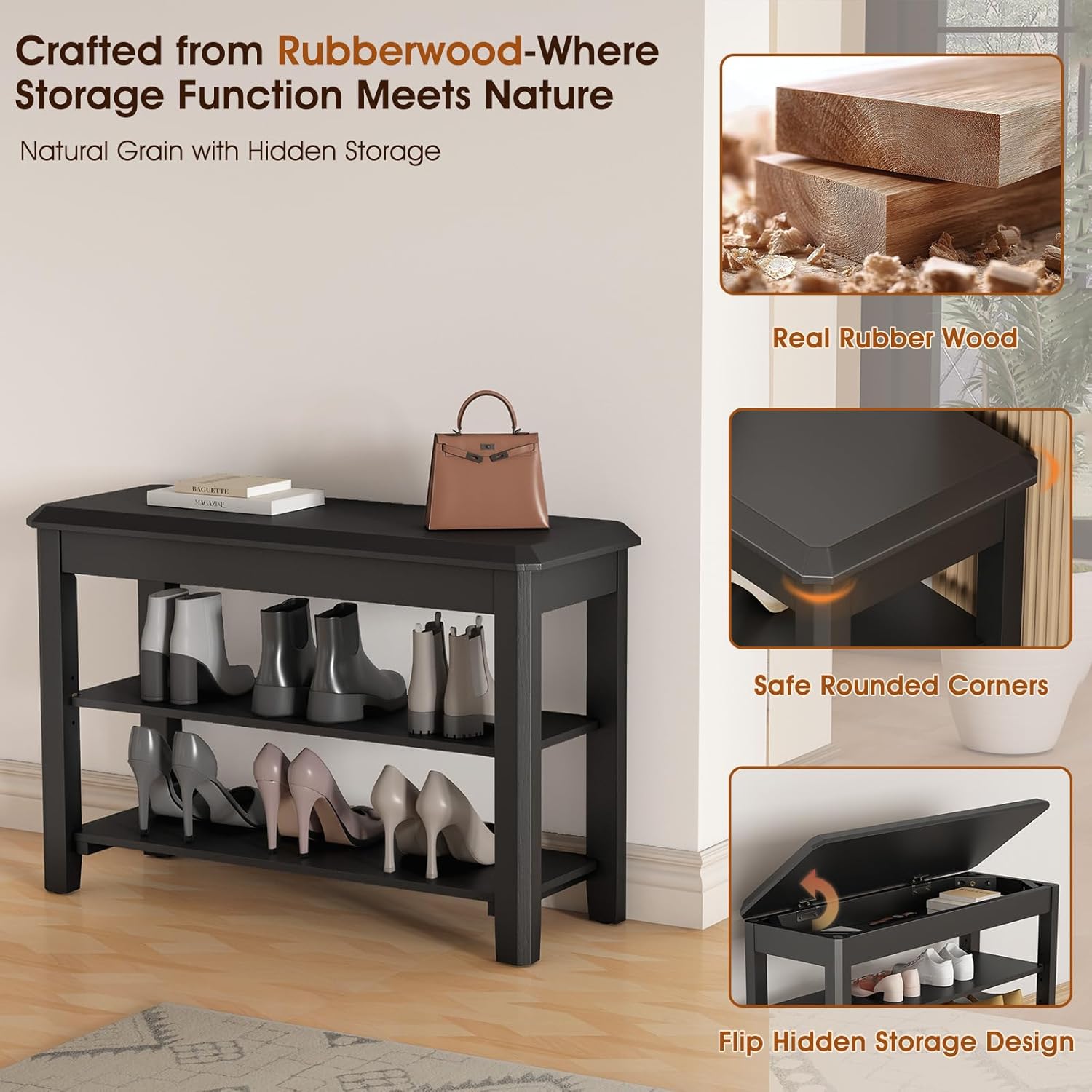 - Sturdy & Durable Real Rubberwood Material: Crafted from 100% 3A-grade rubberwood, this shoe rack bench offers exceptional durability and strength. The textured rubberwood cushion adds a touch of natural beauty and warmth. The structure provides outstanding stability, supporting up to 550lbs with ease. Whether you're changing shoes or relaxing, this sturdy bench provides reliable support for years in high-traffic family areas