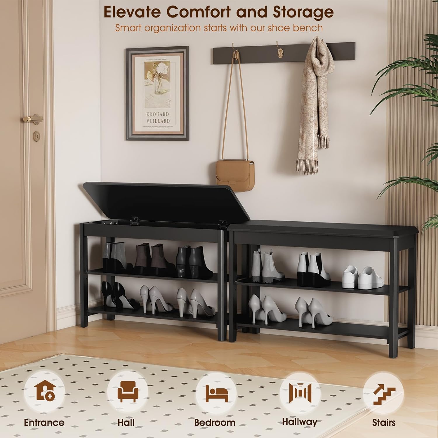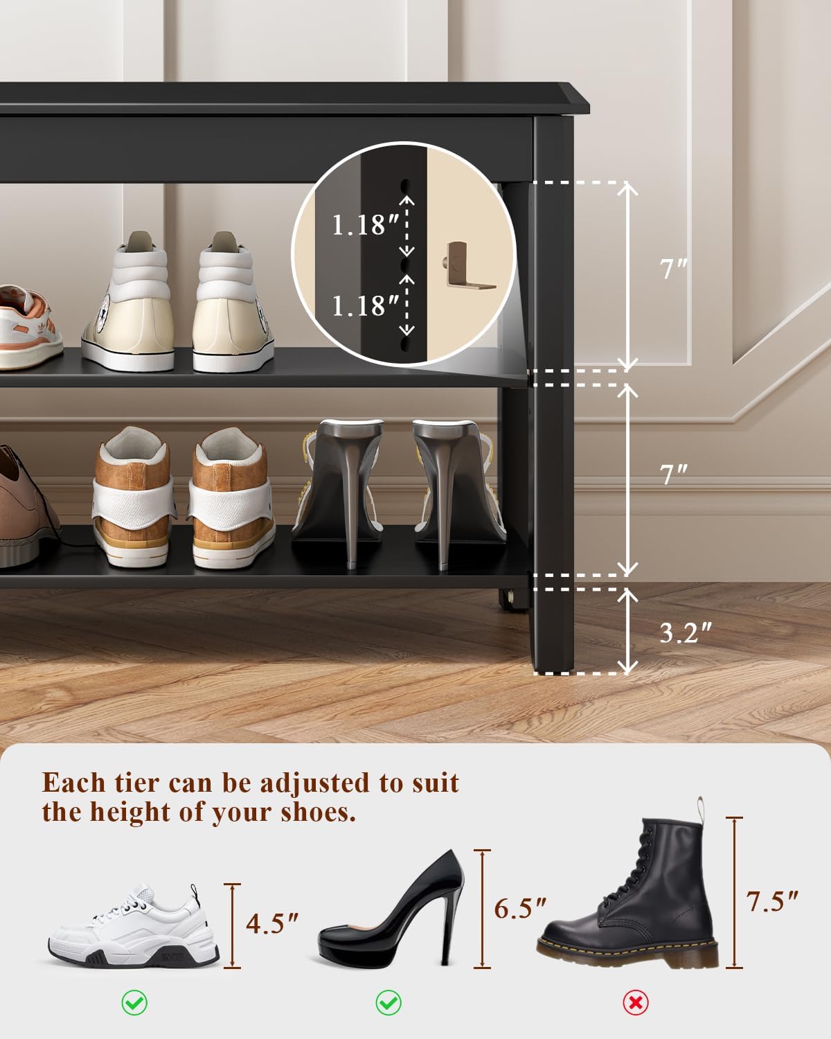 - Compact & Adjustable 3-Tier Shoe Storage Solution: Maximize your space with the 3-tier design of this shoe bench, which holds 6-10 pairs of shoes with adjustable shelves for customized height configurations. Whether placed in a narrow hallway, closet, or tight corner, this compact storage bench helps keep your entryway neat and tidy. The dimensions (31.5"L x 11.8"W x 20.5"H) ensure the perfect height and width for comfortable seating while changing shoes, offering ample room without taking up unnecessary space