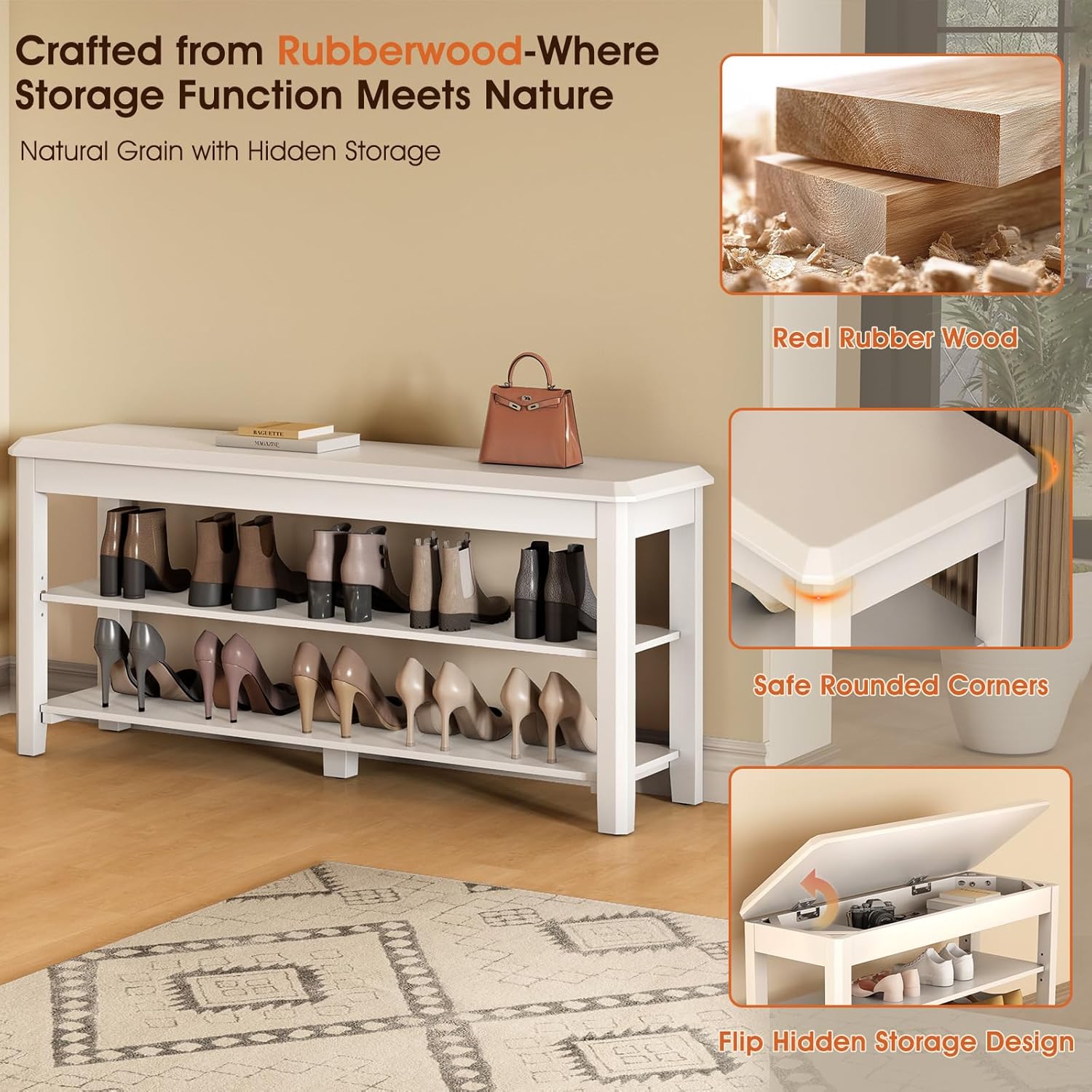 - Sturdy & Durable Real Rubberwood Material: Crafted from 100% 3A-grade rubberwood, this shoe rack bench offers exceptional durability and strength. The textured rubberwood cushion adds a touch of natural beauty and warmth. The structure provides outstanding stability, supporting up to 550lbs with ease. Whether you're changing shoes or relaxing, this sturdy bench provides reliable support for years in high-traffic family areas