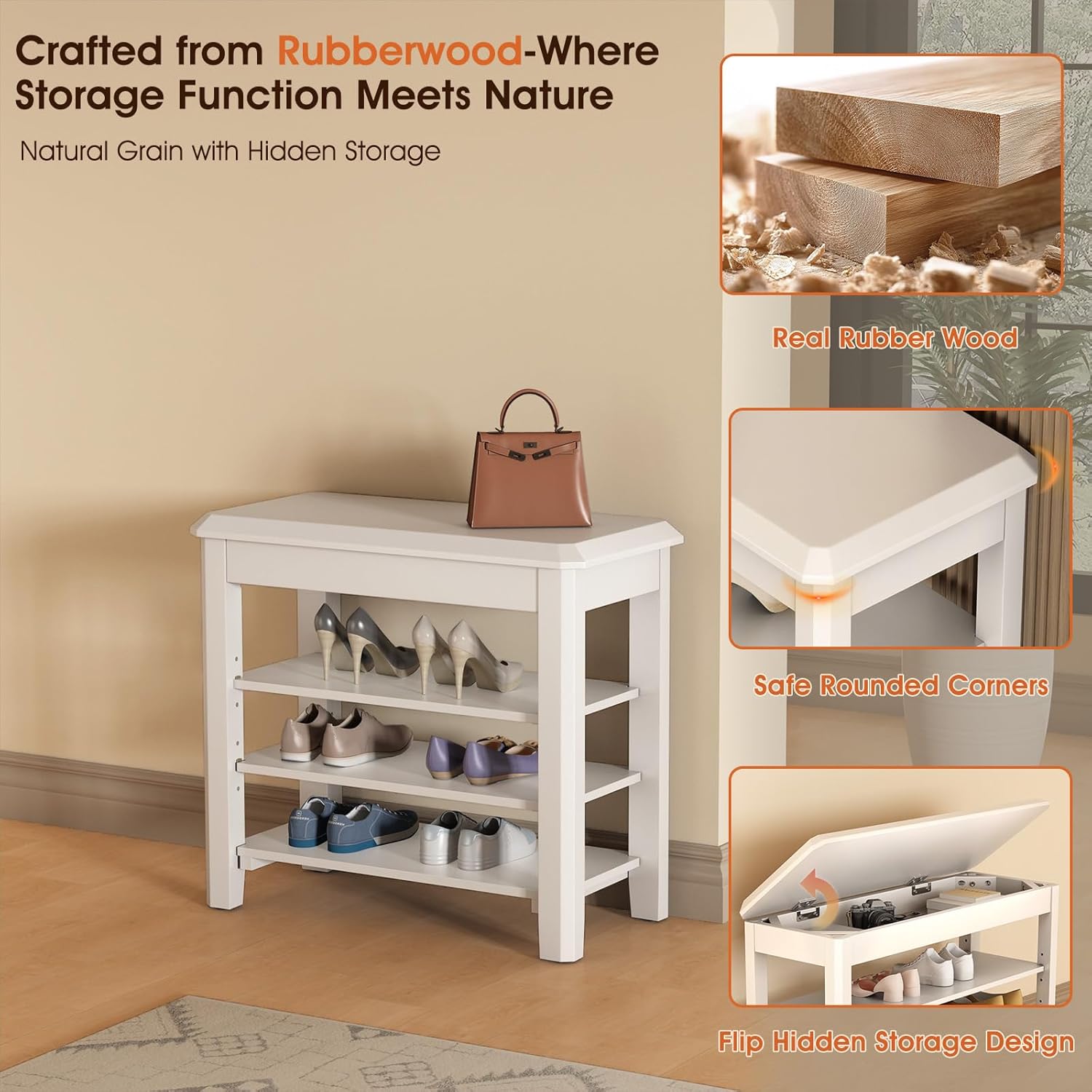 Shoe Rack Bench Seat Rubberwood 3-Tier Wooden Storage Bench 550lbs Compact Mid-Century Modern Design for Entryway, Hallway, Closet, Front Door Entrance, Foyer