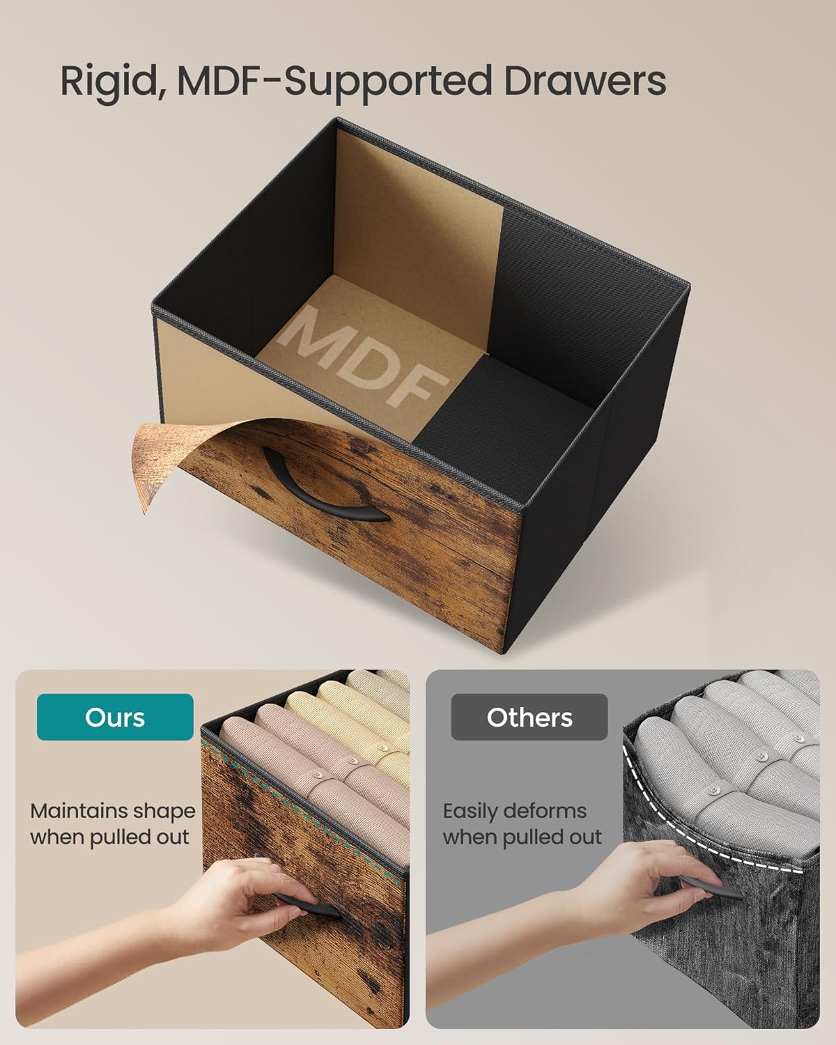 - free Solid Construction: Crafted with a steel frame, particleboard top, and non-woven fabric drawers with MDF structures, this drawer tower is durable and sturdy, with the top holding up to 30 kg, each large drawer 10 kg, and each small drawer 5 kg
