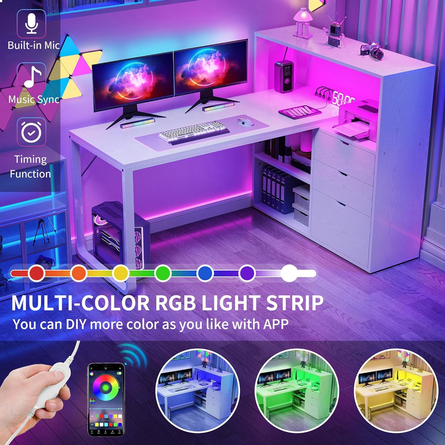 - Smart LED Light Strips: Our L-shaped desk features a beautiful RGB LED light strip, flexibly controlled by a phone app or remote control, and you can customize any color you like via app. Plus, choose from various modes including music sync and timer functions to enhance the mood and inspire creativity while working