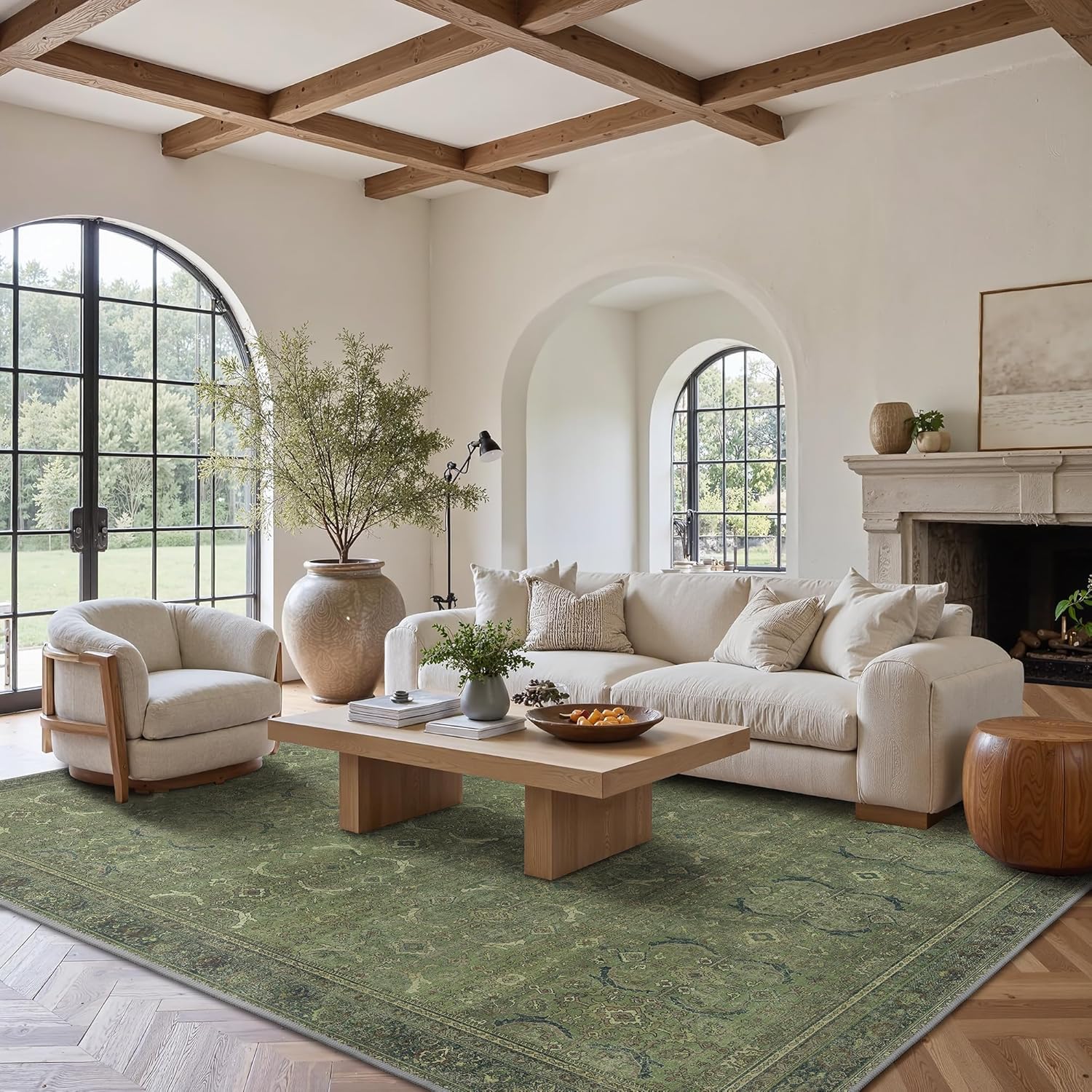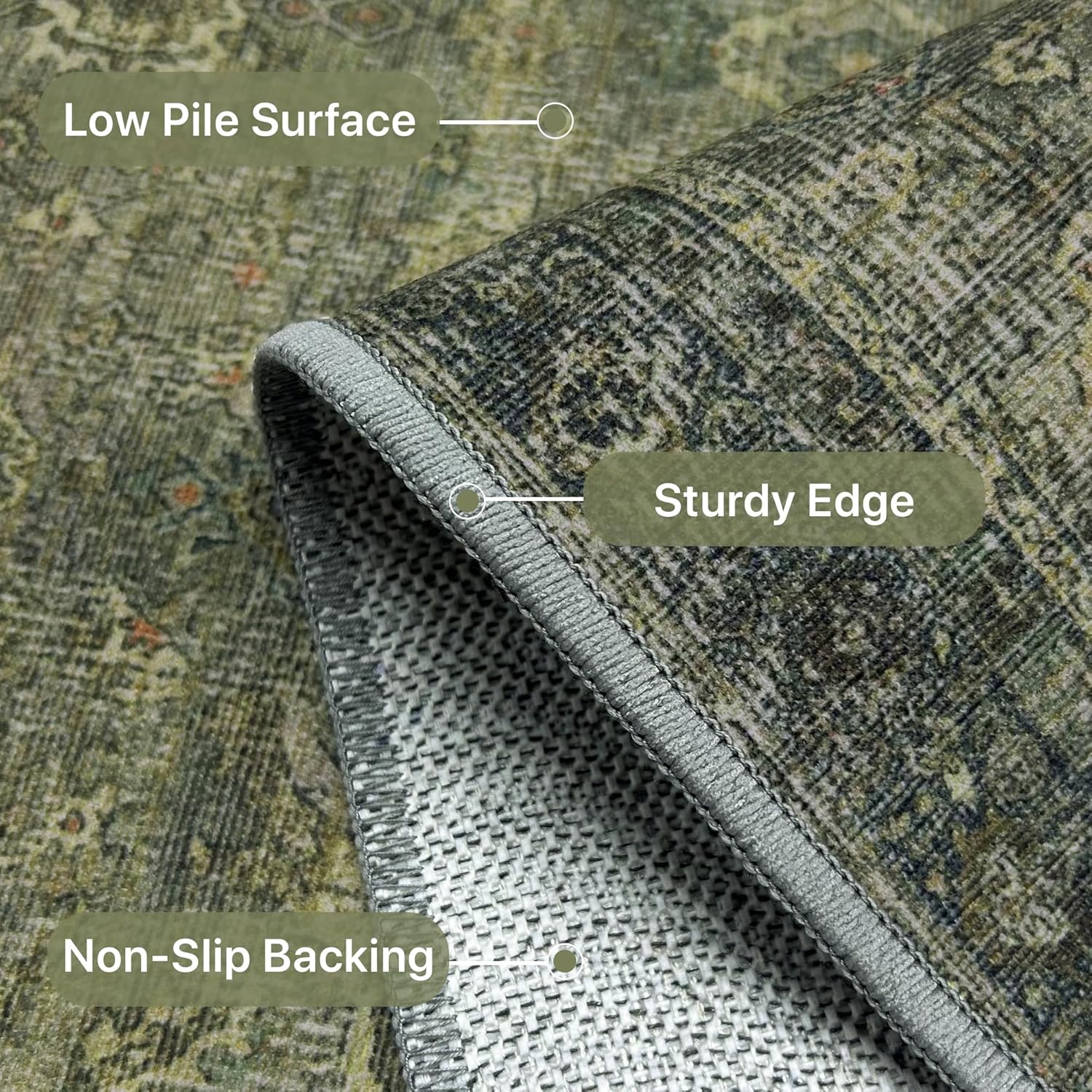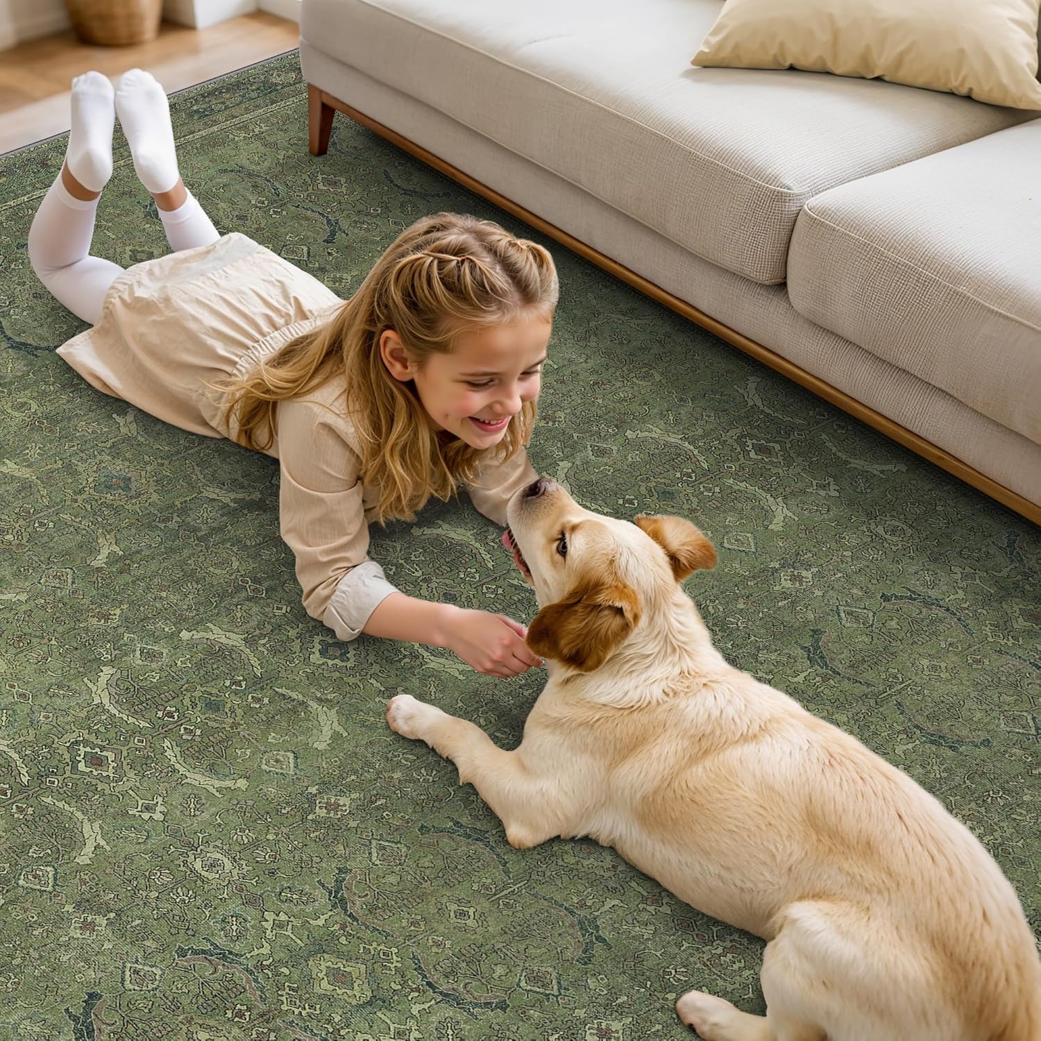 8X10 Area Rugs Machine Washable Rugs for Living Room, Vintage Boho Large Rugs for Bedroom Dining Room, Non Slip Indoor Soft Distressed Lightweight Thin Low Pile Carpet, Vivid Green