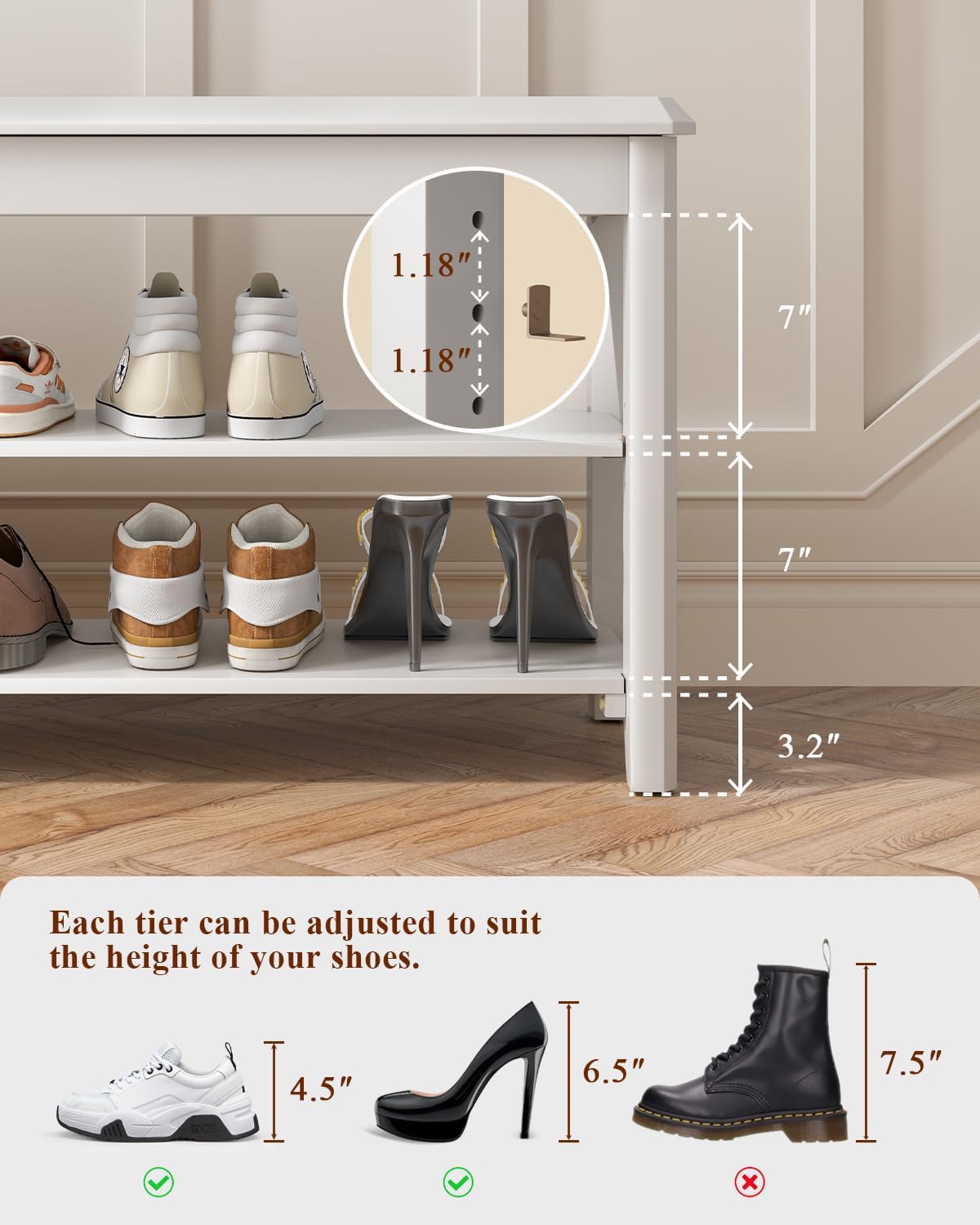 - Compact & Adjustable 3-Tier Shoe Storage Solution: Maximize your space with the 3-tier design of this shoe bench, which holds 6-10 pairs of shoes with adjustable shelves for customized height configurations. Whether placed in a narrow hallway, closet, or tight corner, this compact storage bench helps keep your entryway neat and tidy. The dimensions (23.6"L x 11.8"W x 20.5"H) ensure the perfect height and width for comfortable seating while changing shoes, offering ample room without taking up unnecessary space