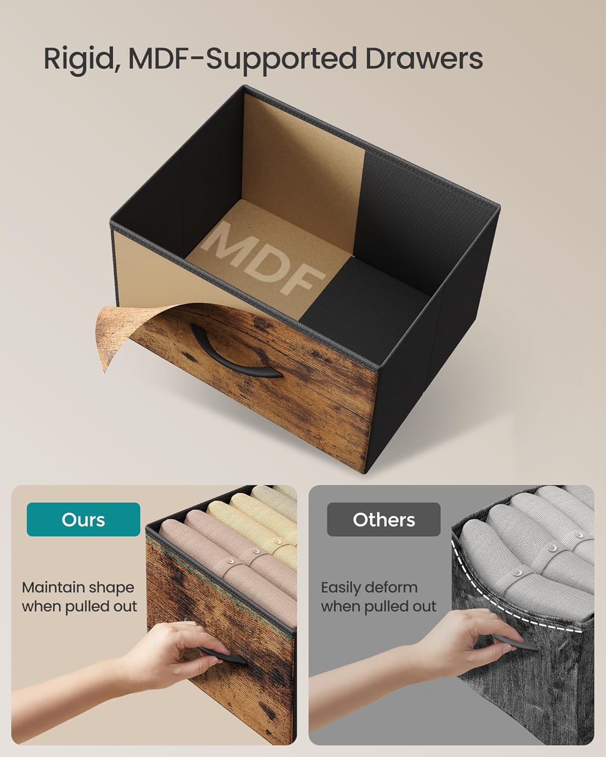 - Stability and Safety Ensured: This fabric dresser comes with adjustable feet to prevent wobbles on slightly uneven floors and an anti-tip kit for safety, ensuring peace of mind