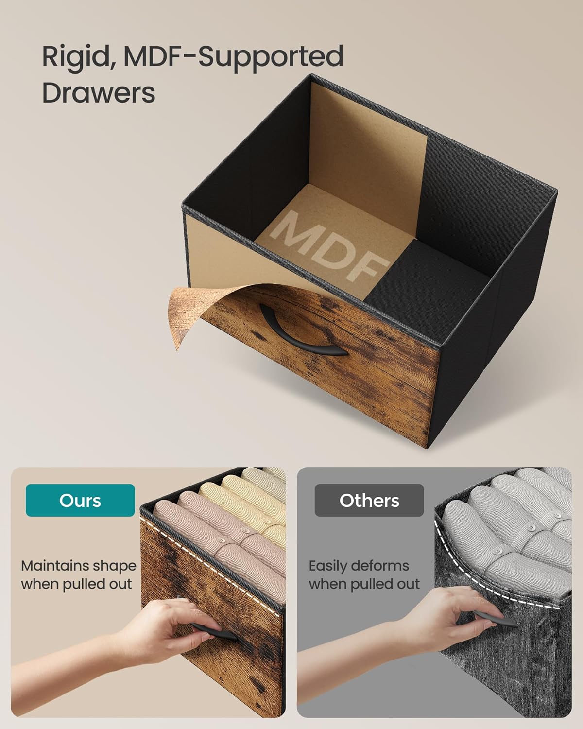 - Stability and Safety Ensured: This fabric dresser comes with adjustable feet to prevent wobbles on slightly uneven floors and an anti-tip kit for safety, ensuring peace of mind