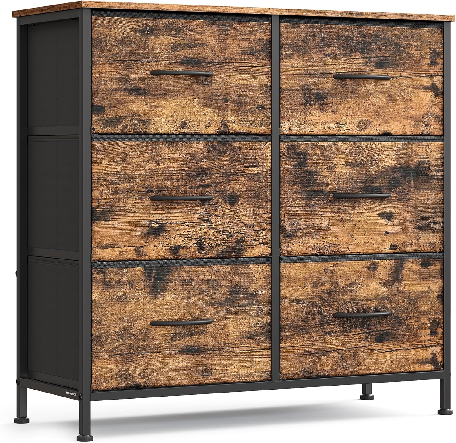 SONGMICS Dresser for Bedroom, Chest of Drawers, TV Stand, Steel, MDF, 6 Non-Woven Fabric Drawers, Storage Organizer Unit, Closet, Entryway, Rustic Brown and Ink Black ULGS123B02S