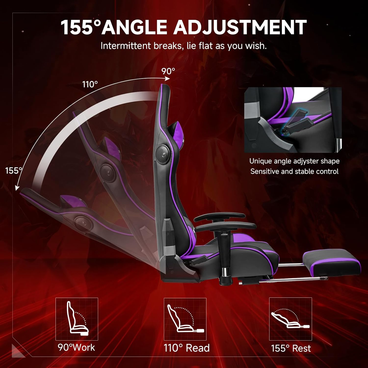 - 【Multi Function】Effortlessly switch between work,gaming and relaxation modes with the chair’s adjustable reclining backrest.Tilt to 90°for focused work,110° for casual gaming or recline back to 155°for a quick nap.The smooth reclining mechanism allows easy angle adjustment,while the sturdy frame ensures stable support at any position.Whether you're deep in a competitive game or unwinding after a long day,this chair delivers exceptional comfort tailored to your needs.