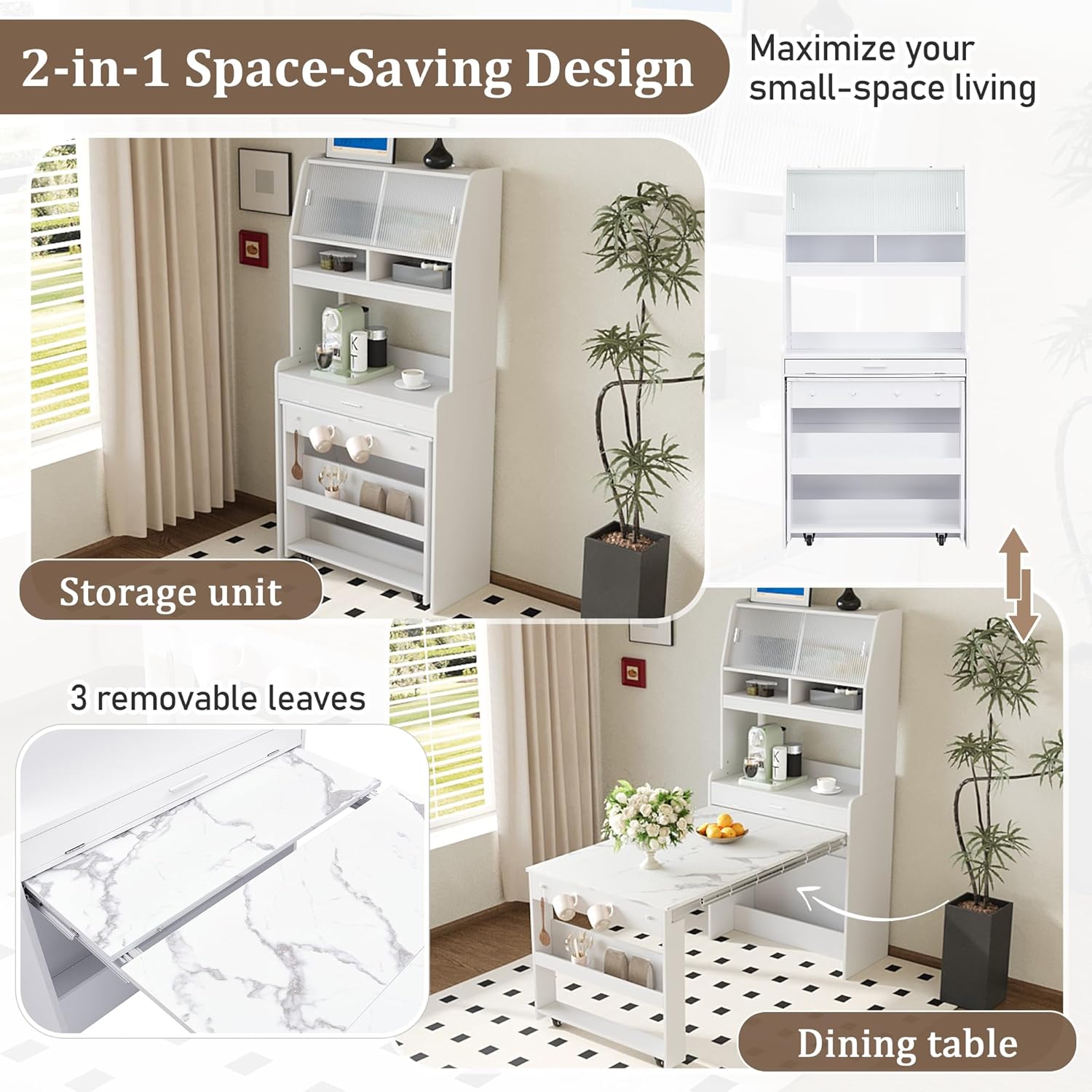 - ✔ Space-Saving Expandable Table: Extend the wheeled table from 0 to 50.4”L using removable leaves. When not in use, slide it under the buffet to save space. The counter-height workstation doubles as a coffee bar, office desk, or prep area, with a side shelf + 4 hooks for essentials.