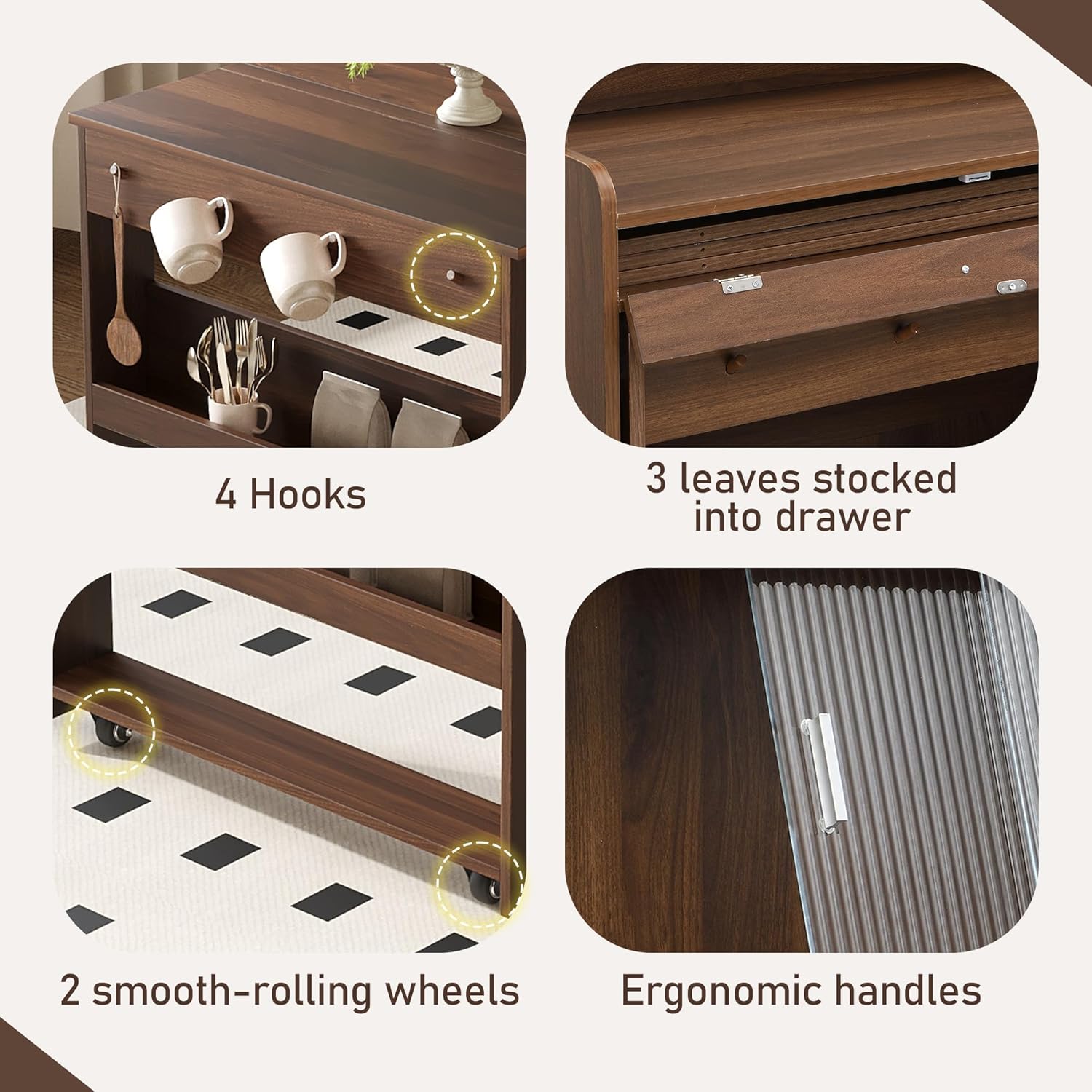 - ✔ Space-Saving Expandable Table: Extend the wheeled table from 0 to 50.4”L using removable leaves. When not in use, slide it under the buffet to save space. The counter-height workstation doubles as a coffee bar, office desk, or prep area, with a side shelf + 4 hooks for essentials.