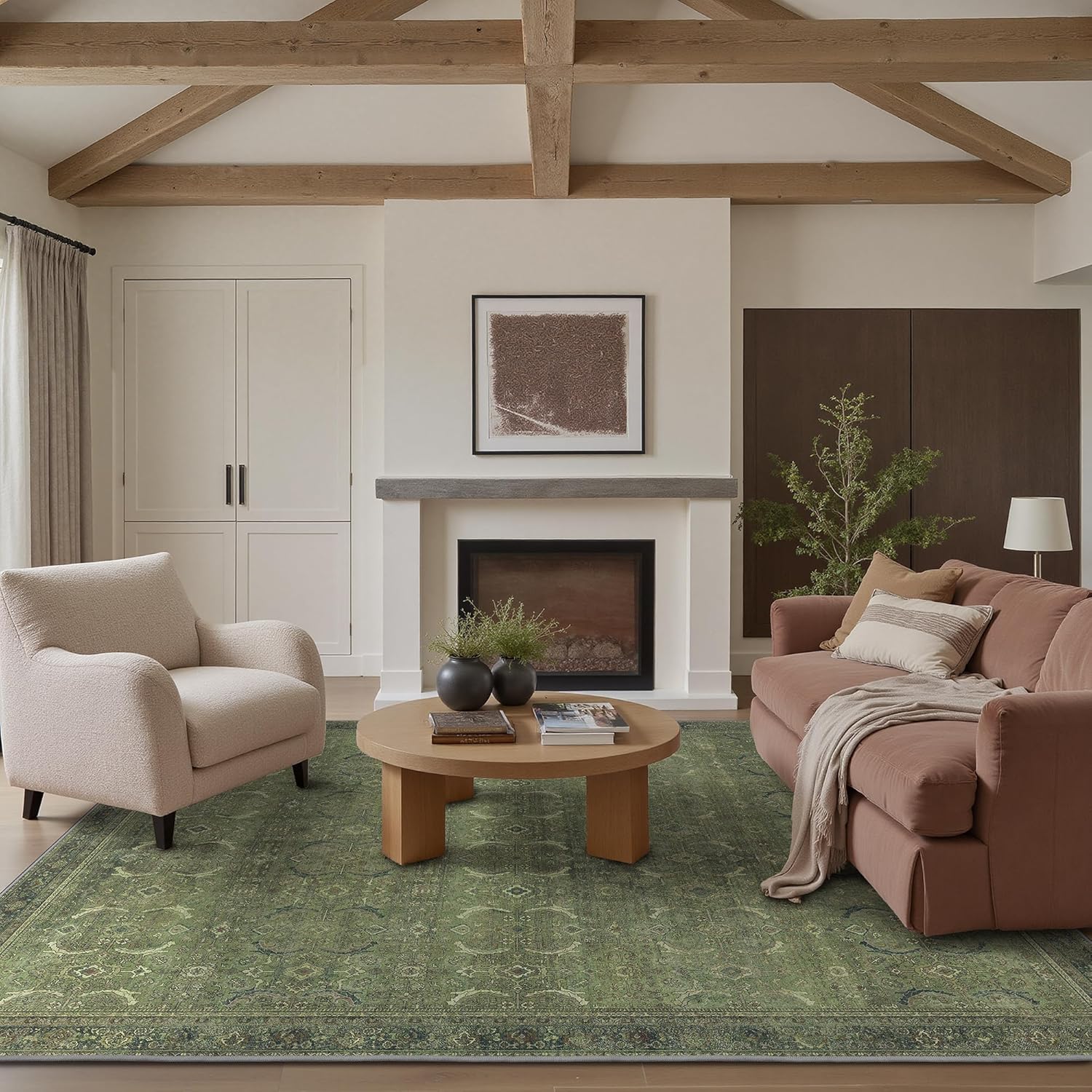 9X12 Area Rugs Machine Washable Rugs for Living Room, Vintage Boho Large Rugs for Bedroom Dining Room, Non Slip Indoor Soft Distressed Lightweight Thin Low Pile Carpet, Vivid Green