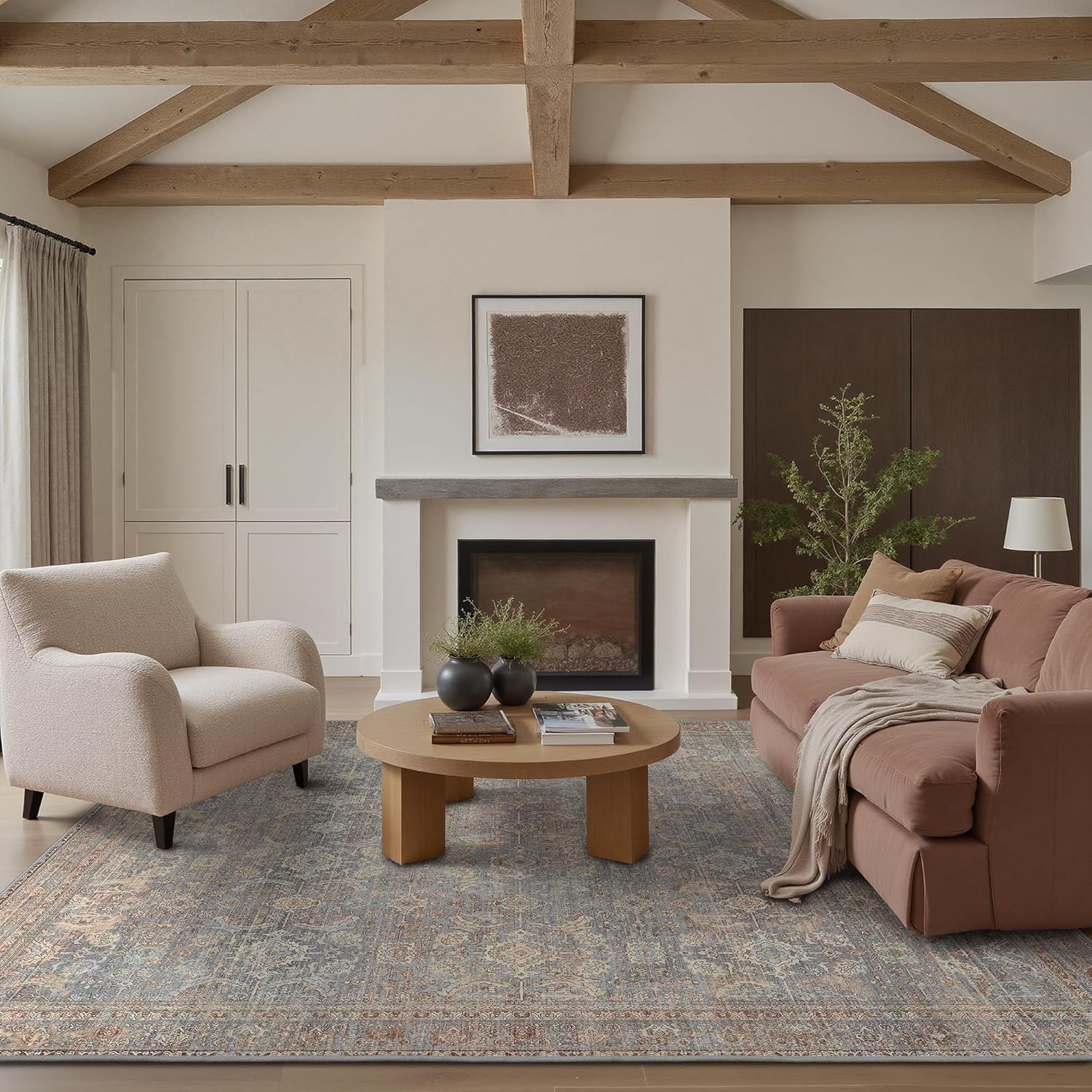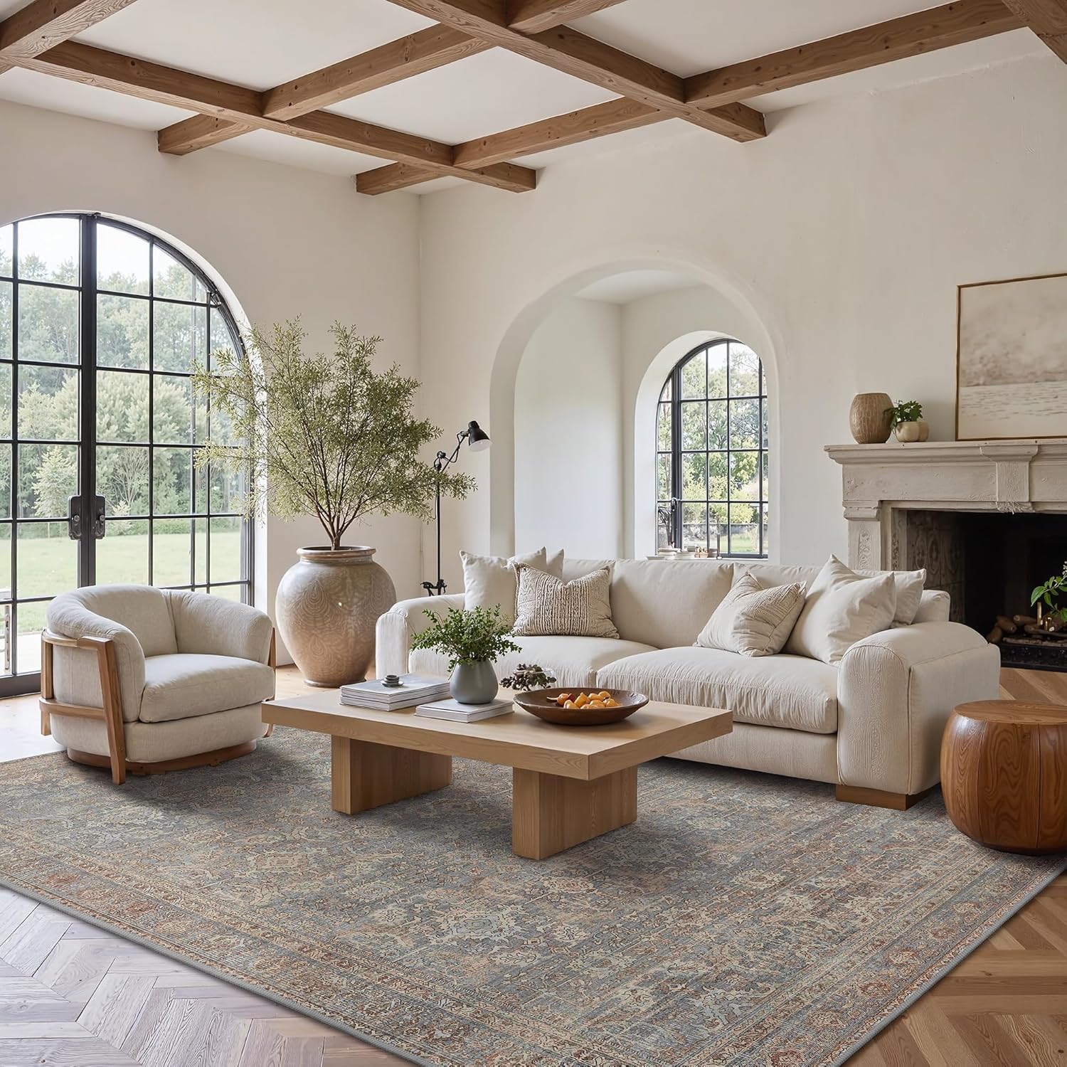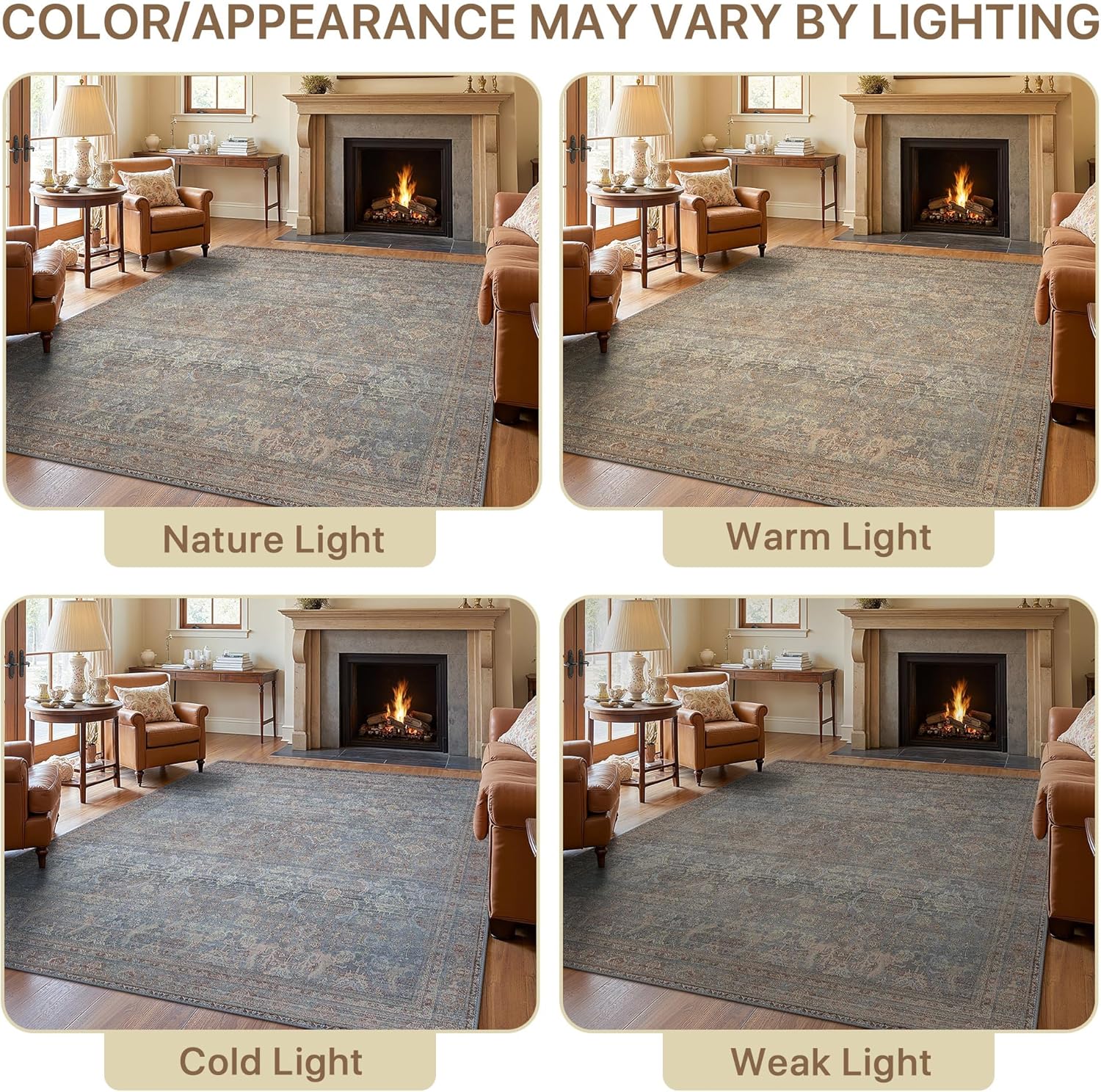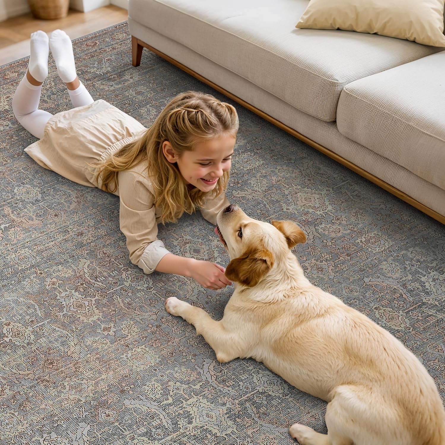 9X12 Area Rugs Machine Washable Rugs for Living Room, Vintage Boho Large Rugs for Bedroom Dining Room, Non Slip Indoor Soft Distressed Lightweight Thin Low Pile Carpet, Dusty Blue
