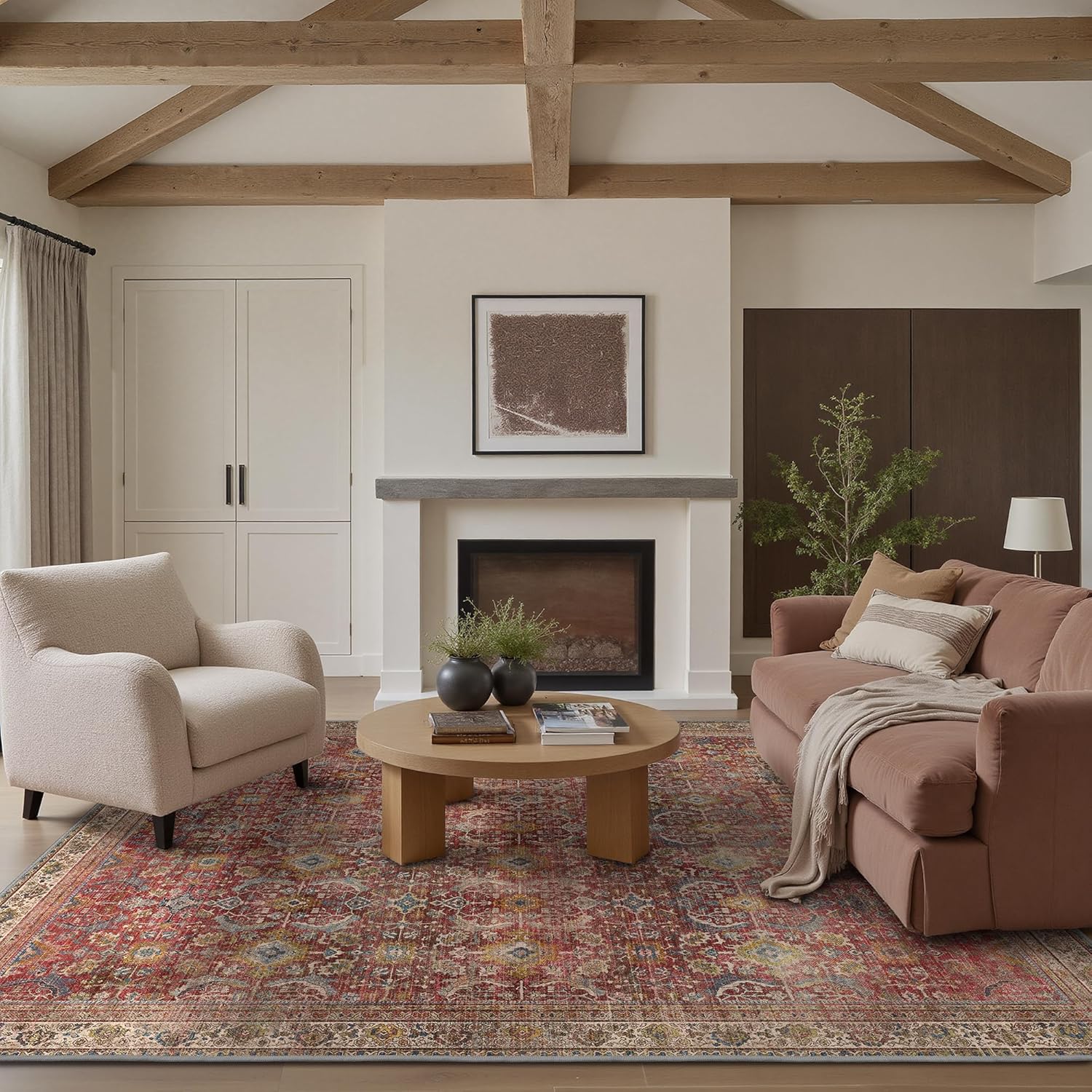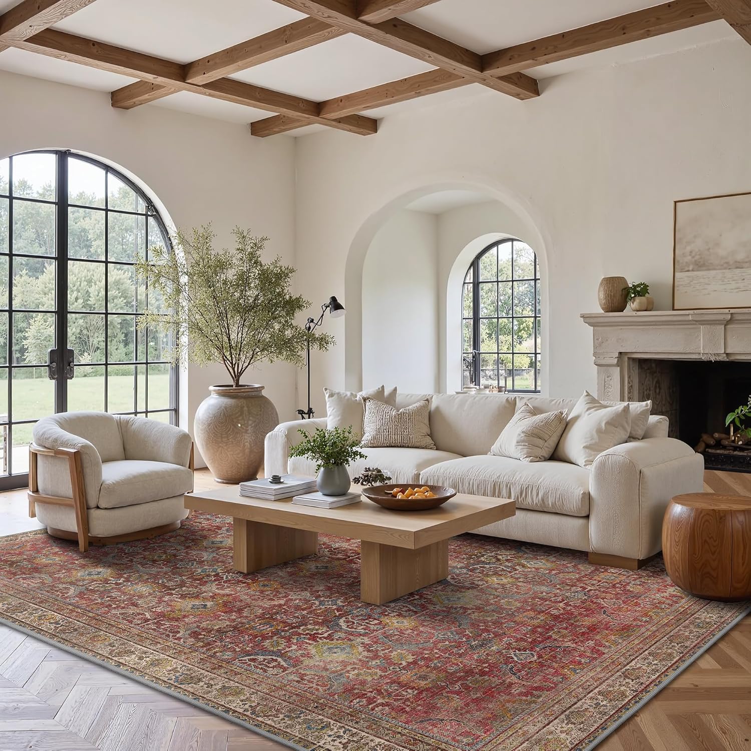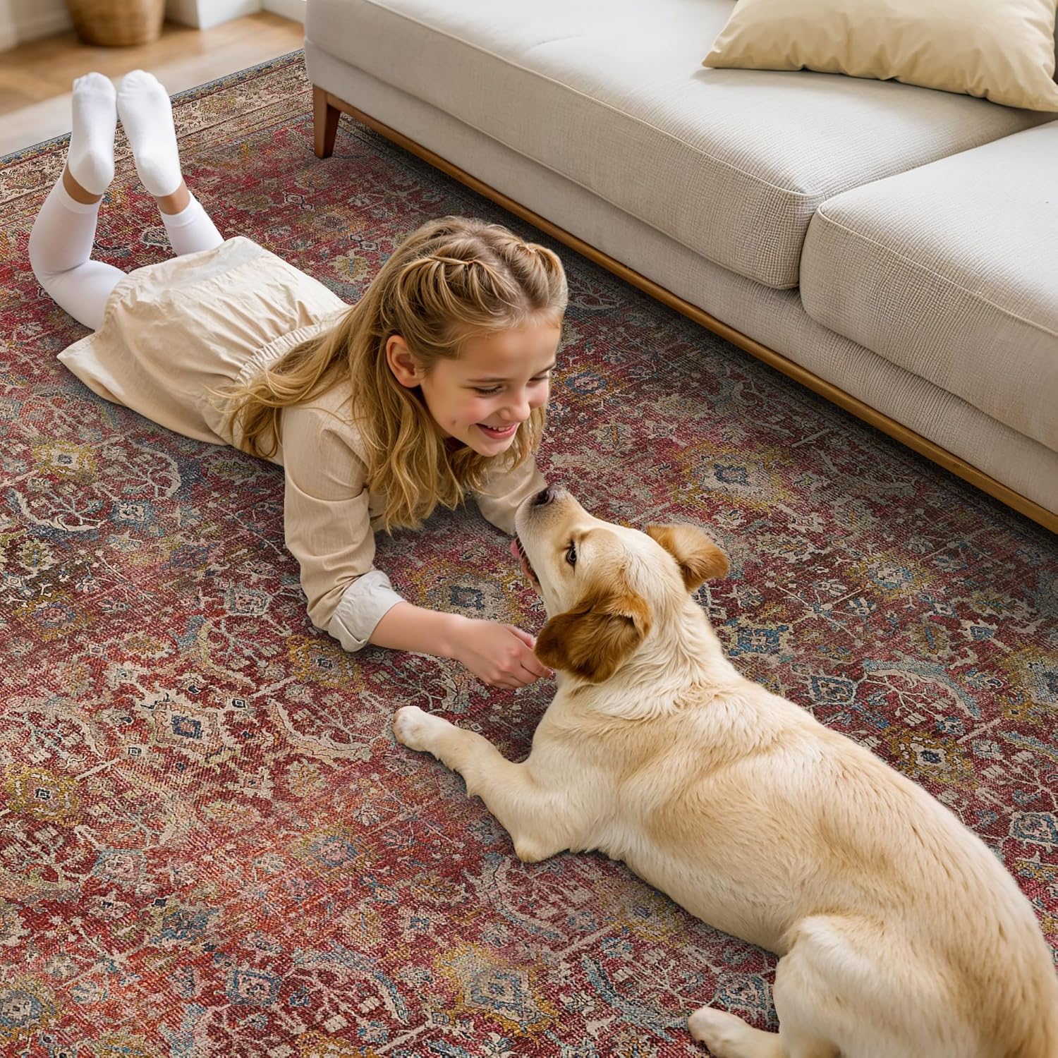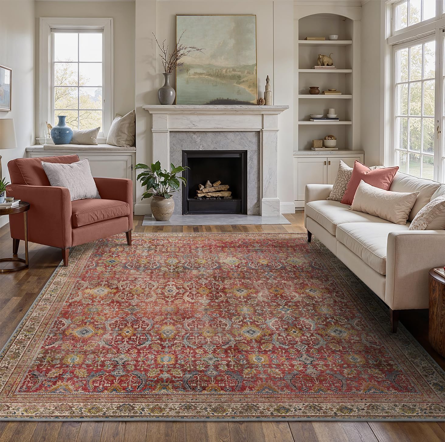 9X12 Area Rugs Machine Washable Rugs for Living Room, Vintage Boho Large Rugs for Bedroom Dining Room, Non Slip Indoor Soft Distressed Lightweight Thin Low Pile Carpet, Rust Red