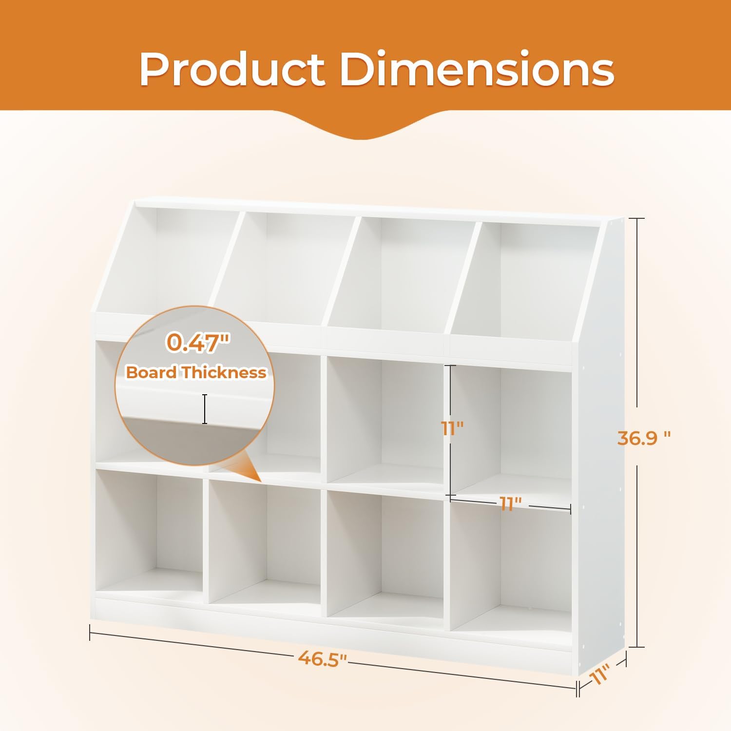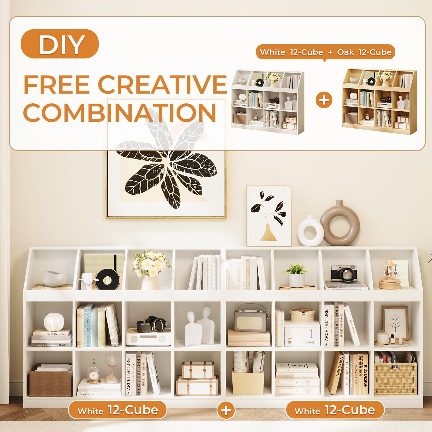 12-Cube Wooden Storage Bookcase - 11-Inch Open Shelf Cabinet, Simple Modern Bookshelf Organizer for Home Office, Living Room, White