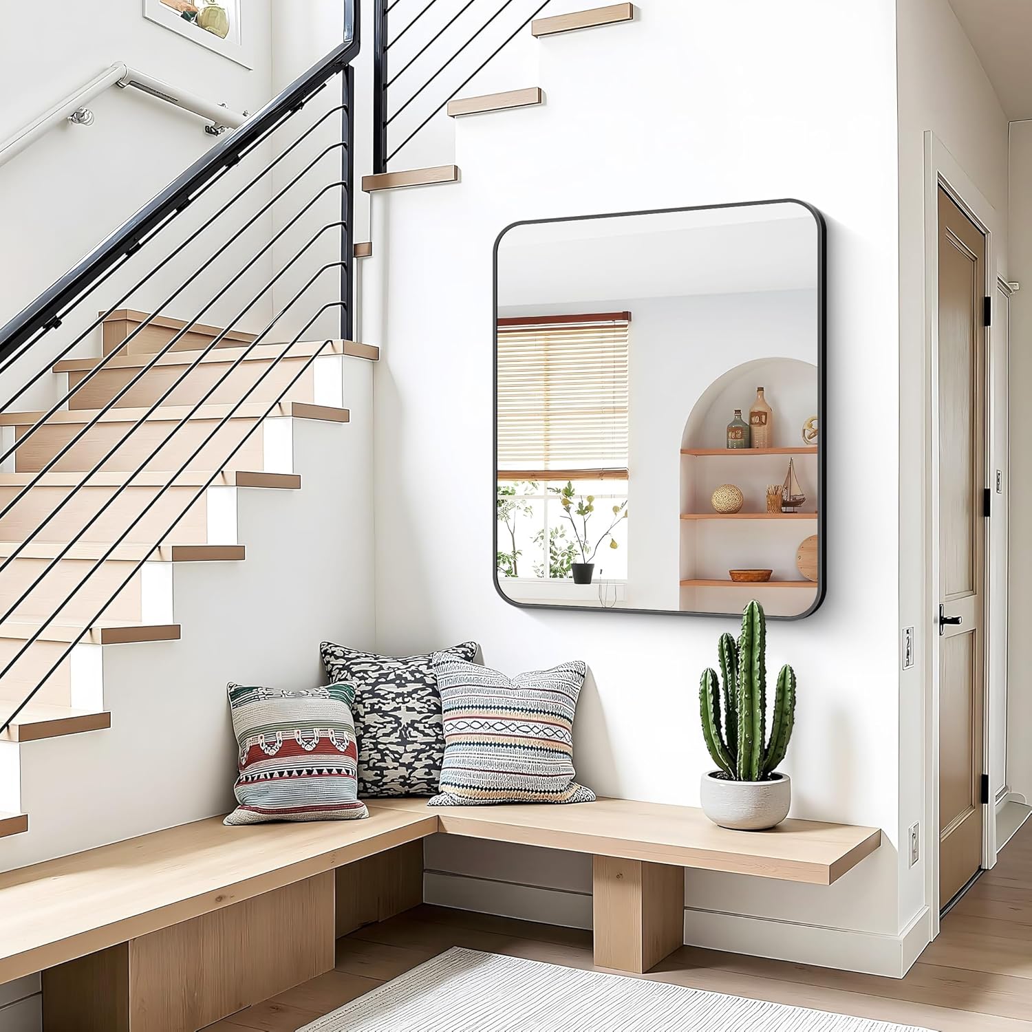 Bathroom Mirror, 36 x 30 inch Metal Framed Black Rectangle Mirror, Rounded Corner Rectangular Vanity Mirror, Wall Mounted Mirror for Modern Bedroom Living Room Hangs Horizontal or Vertical